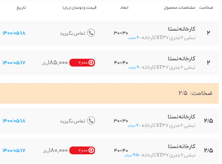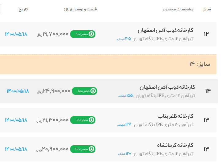 🗓 دوشنبه ۲۰ تیرماه ۱۴۰۱ 🗓 (قیمت ها با احتساب ۹٪ ارزش افزوده میباشد) افزایشی 🔹 تیرآهن ذوب آهن اصفهان دربنگاه تهران سایز۱۲: ۲۳۵۰۰۰۰ سایر۱۴: ۲۹۲۰۰۰۰ سایر۱۶: ...