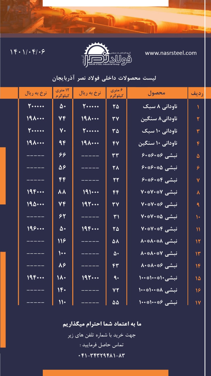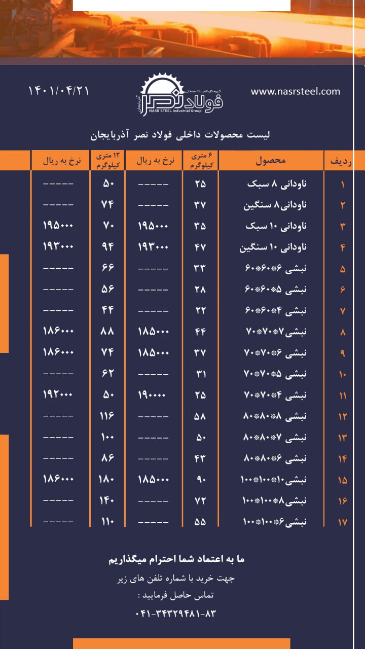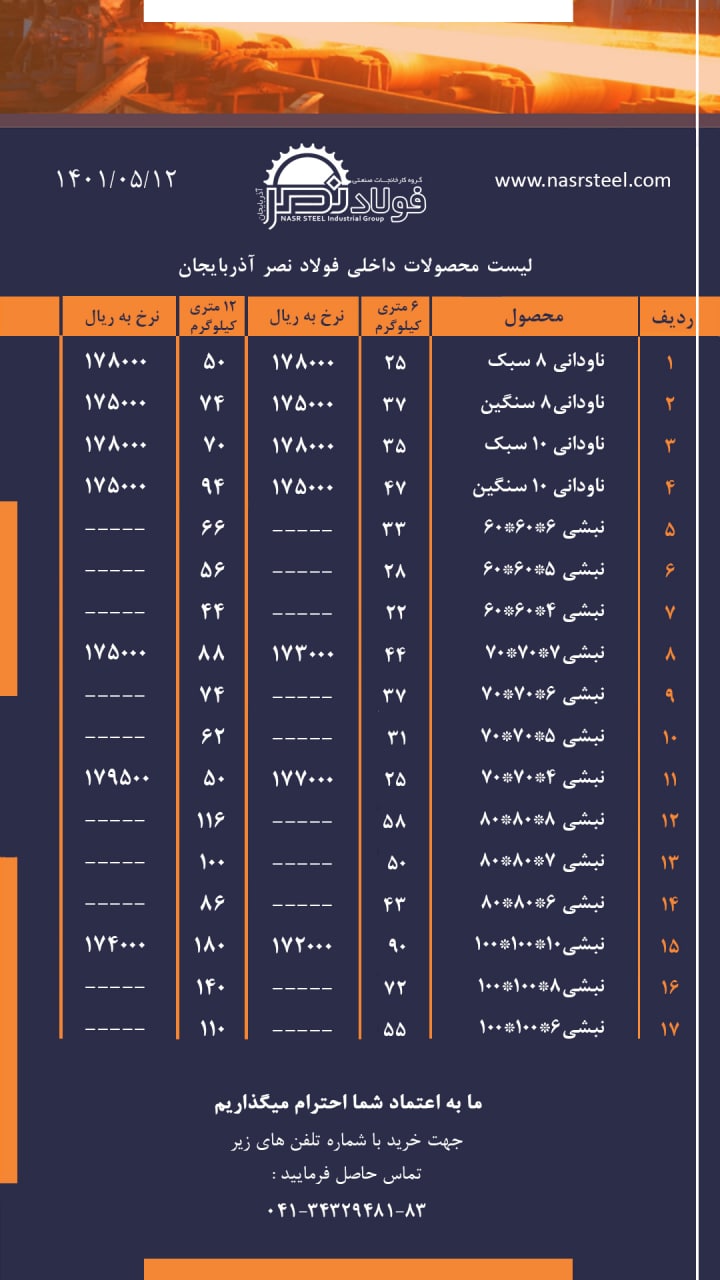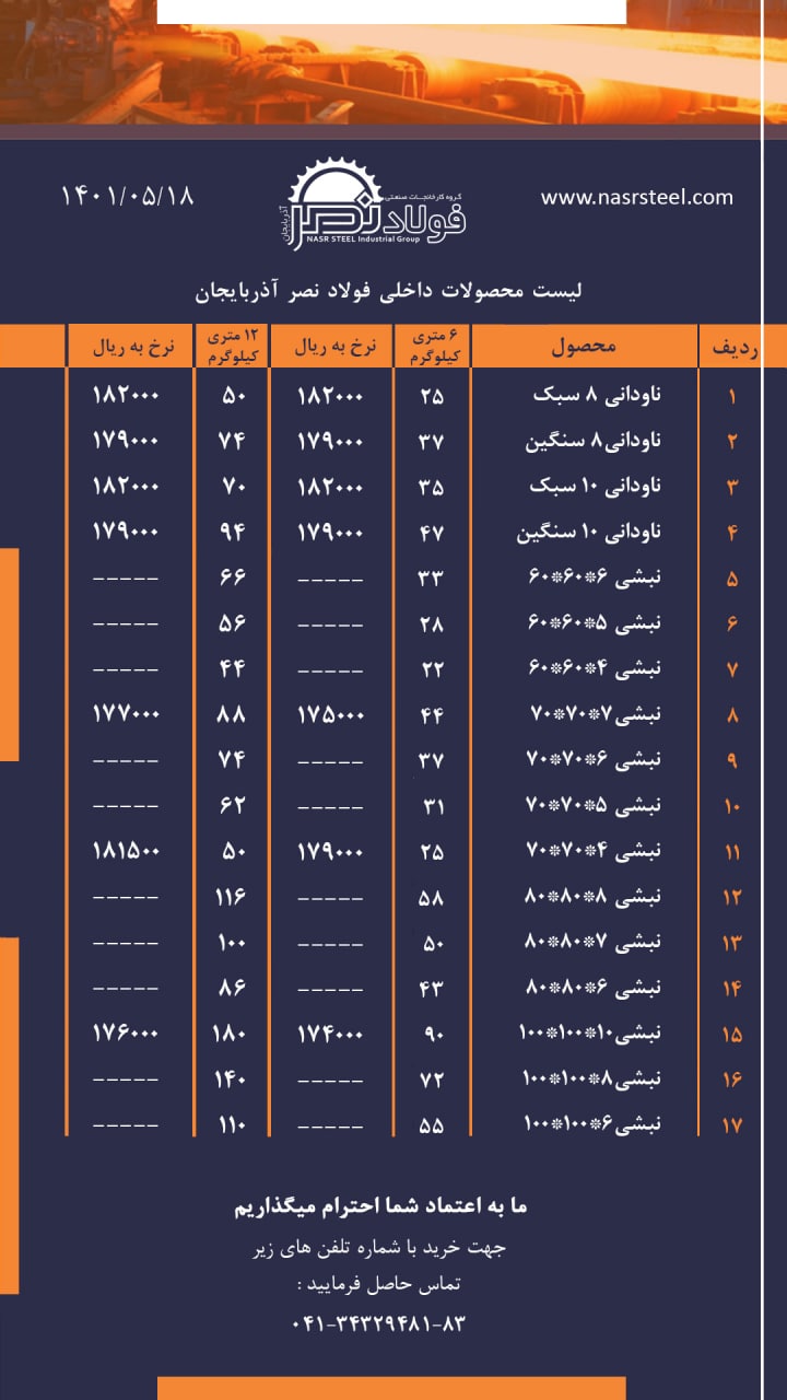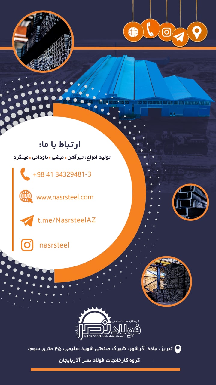 گروه کارخانجات #فولاد_نصر_آذربایجان 📌تولید کننده انواع ناودانی ، نبشی و تیرآهن با استاندارد های روز دنیا 📌صادر کننده نمونه استانی 📍آدرس کارخانه : تبریز ، جاد ...