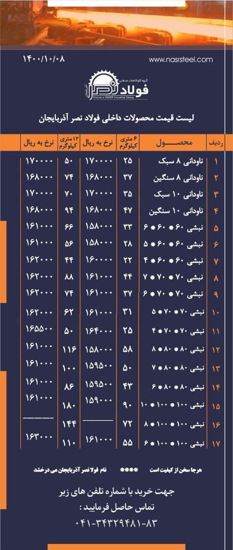 گروه کارخانجات #فولاد_نصر_آذربایجان ⭕️تولید کننده نبشی و ناودانی 👈🏻لیست قیمت محصولات نسبت به آدرس تخلیه شامل تخفیف میباشد. ☎️04134329481 ☎️04134329482 ☎️0413 ...