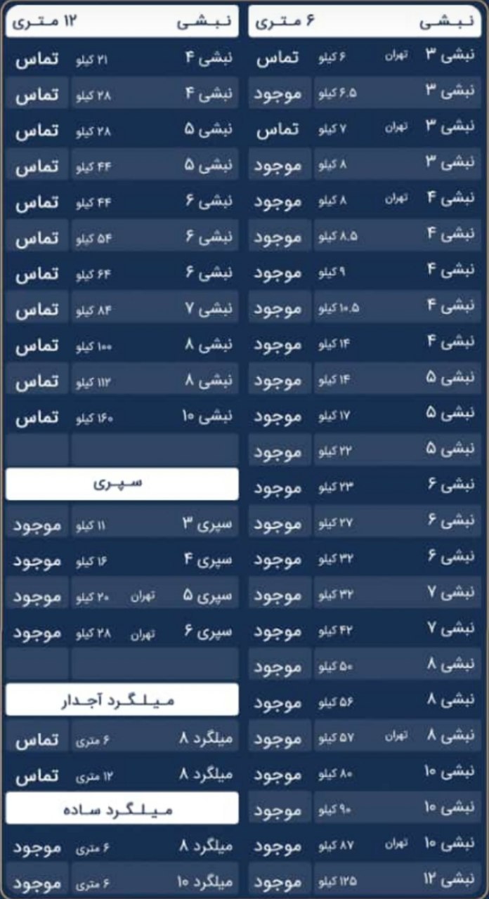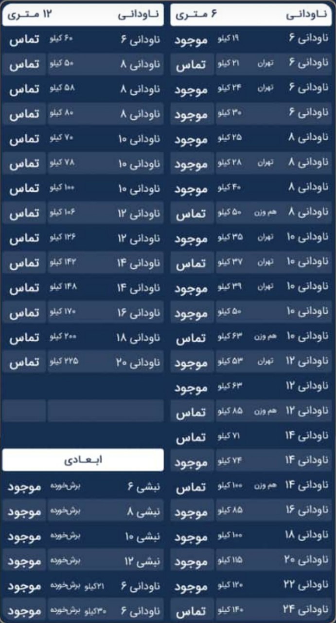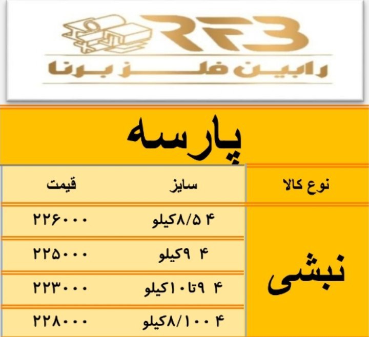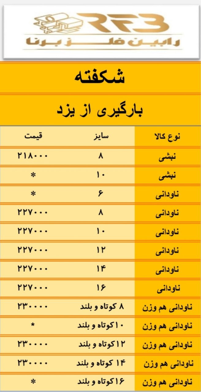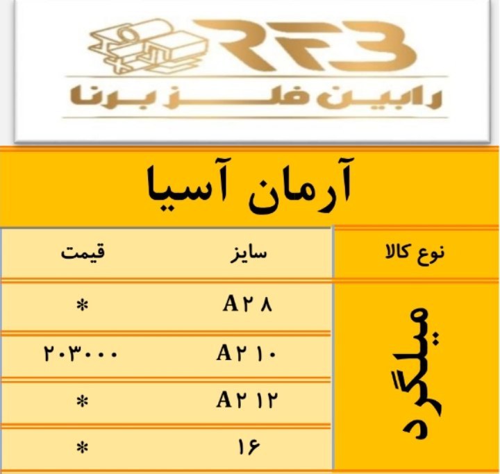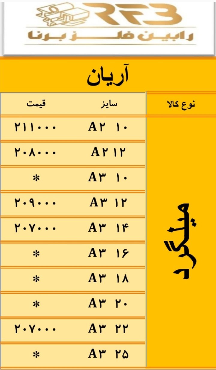 #ضايعاتذوبی 1-روغنی نرمه 14250 2-روغنی ضخیم 14250 3-روغنی ریزبار و پولکی 14250 4-گالوانيزه و ورق روكشدار خودرويي 14000 5-سوپر ويژه 14000 6-كلاف 13950 7-ويژه 1 ...