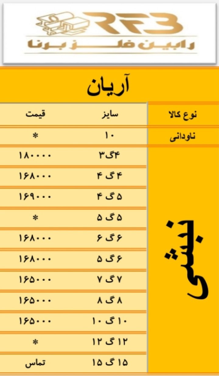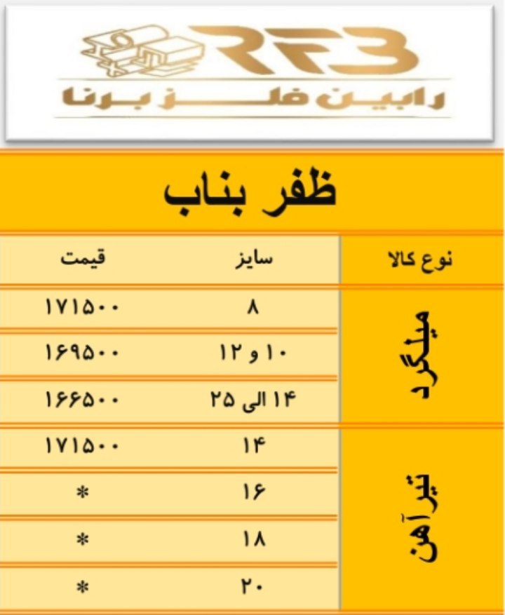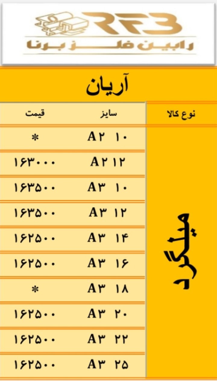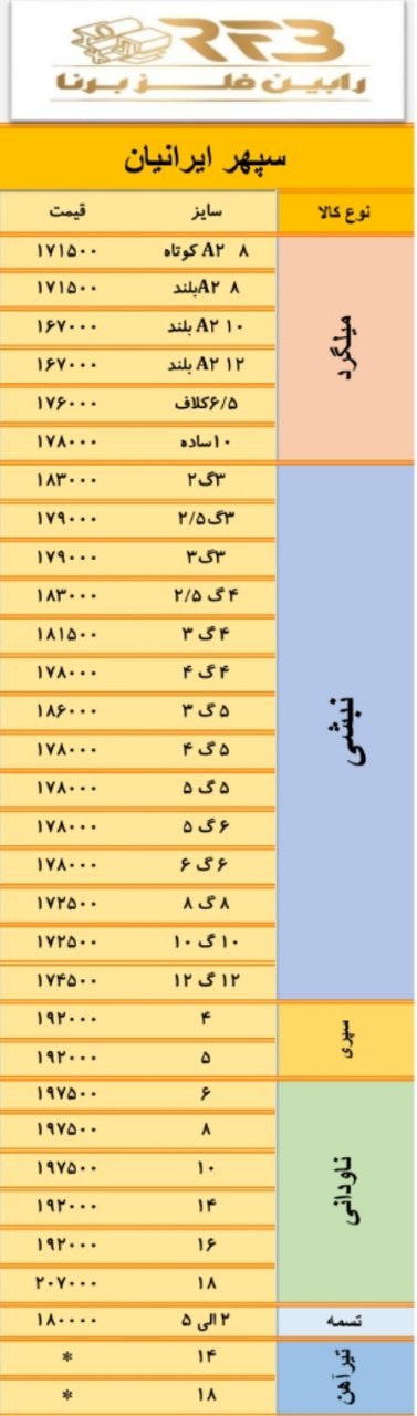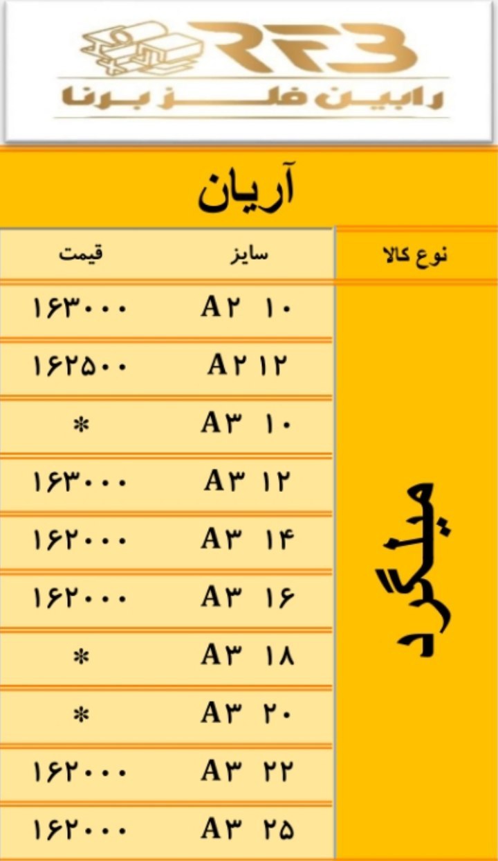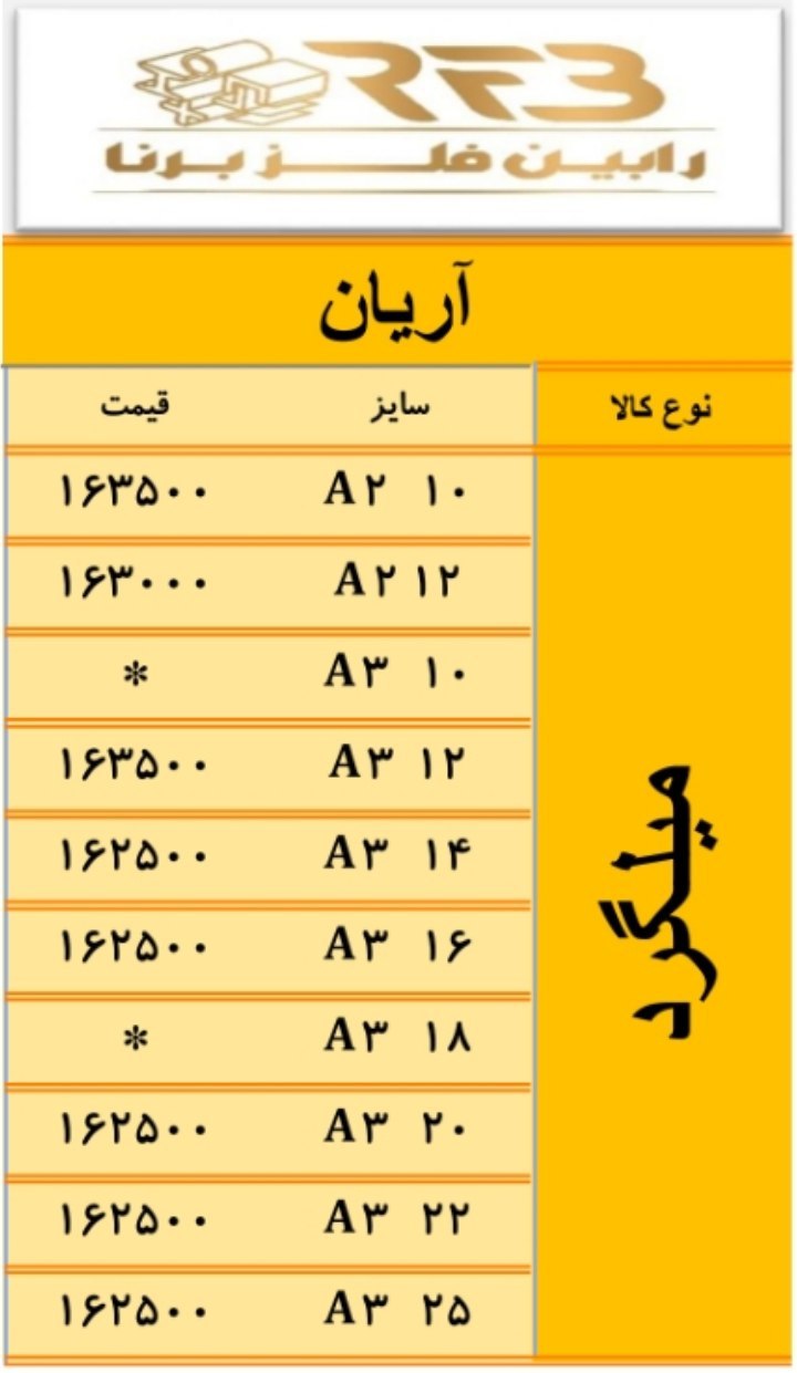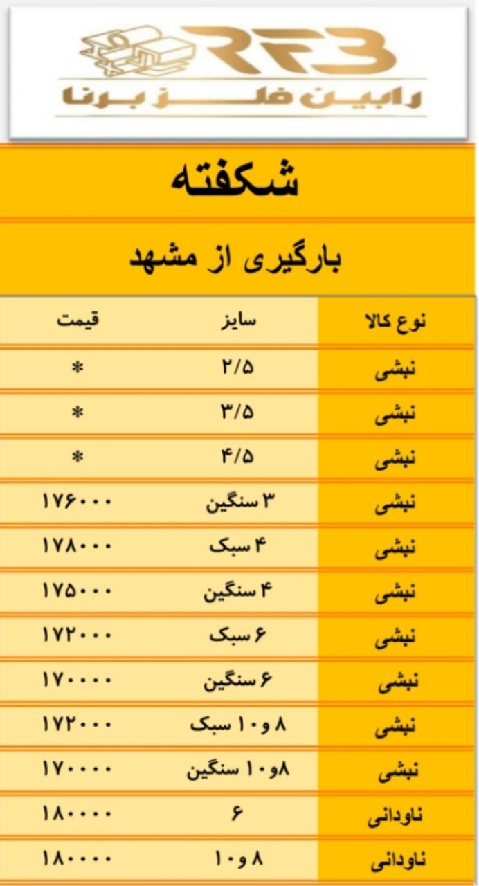 ضایعاتذوبی 1-روغنی نرمه 11450 2-روغنی ضخیم 11450 3-روغنی ریزبار و پولکی 11450 4-گالوانيزه و ورق روكشدار خودرويي 11400 5-سوپر ويژه 11400 6-كلاف 11350 7-ويژه ...