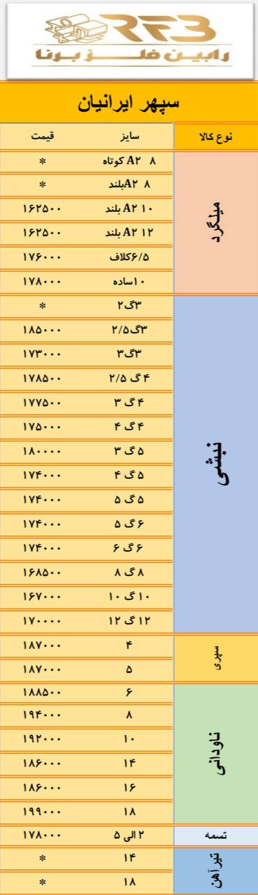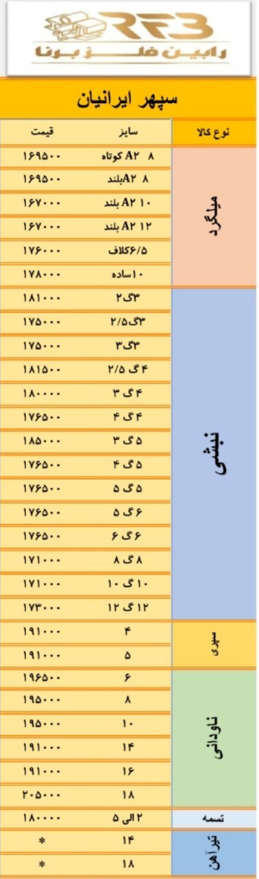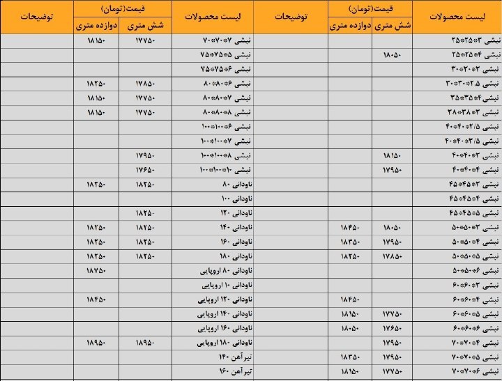 #ضایعاتذوبی 1-روغنی نرمه 11150 2-روغنی ضخیم 11150 3-روغنی ریزبار و پولکی 11150 4-گالوانيزه و ورق روكشدار خودرويي 11050 5-سوپر ويژه 11050 6-كلاف 11000 7-ويژه ...