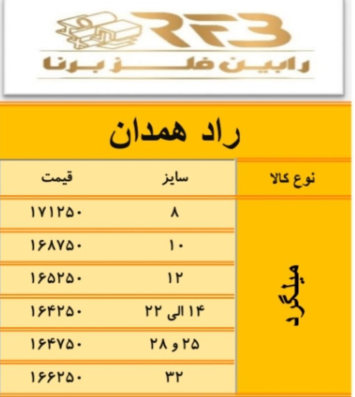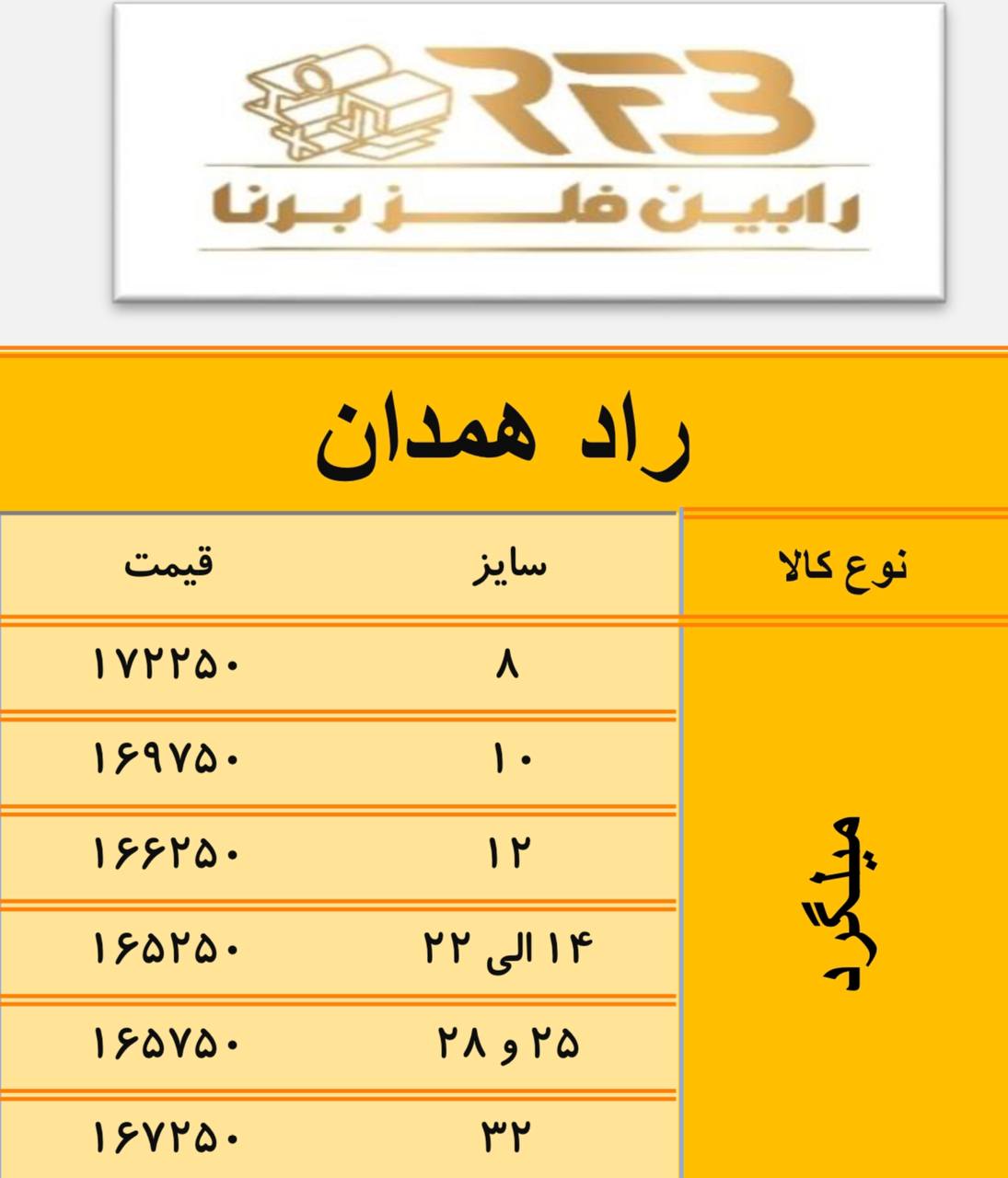🔅رابــیــن فــلــز 🔅 #راد_همدان میلگرد ۸ ۱۶۰۰۵۰ ميلگرد ۱۰ ۱۵۷۵۵۰ ميلگرد ۱۲ ۱۵۵۰۵۰ میلگرد ۱۴الی۲۲ ۱۵۴۰۵۰ میلگرد ۲۵و ۲۸ … #افزایش_قیمت ۲۵۰۰ریالی #راد_همدان میل ...