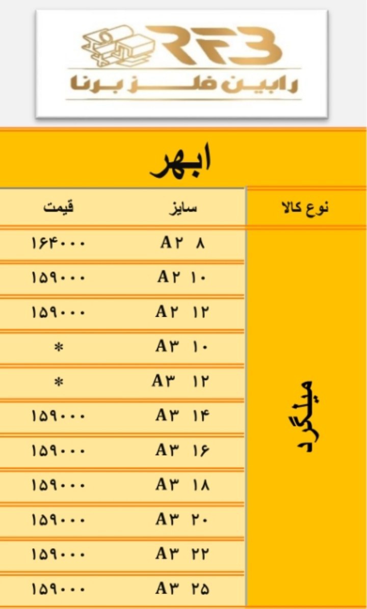 رابــیــن فــلــز 🔅 #مشیز_بردسیر_کرمان گرید A3 سایز ۱۲ : ۱۵۵۵۰۰ گرید A3 سایز ۱۴ : ۱۵۳۰۰۰ گرید A3 سایز ۱۶ : ۱۵۳۰۰۰ گرید A3 سایز ۱۸ : ---------- گرید A3 سایز ۲۰ ...