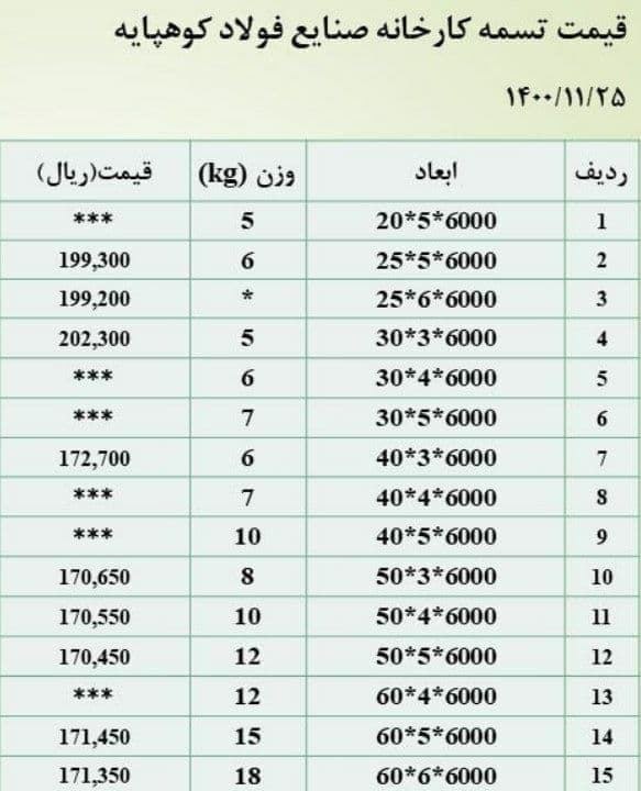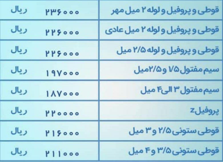 فولاد راد همدان سایز8 👈 173750 سایز 10 👈 171250 سایز12 👈 167750 سایز14 👈 166750 سایز16 👈 166750 سایز18 👈 166750 سایز20 ...