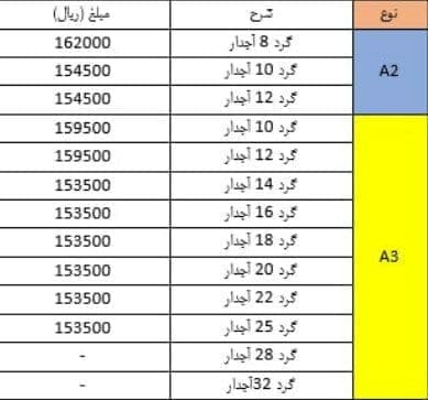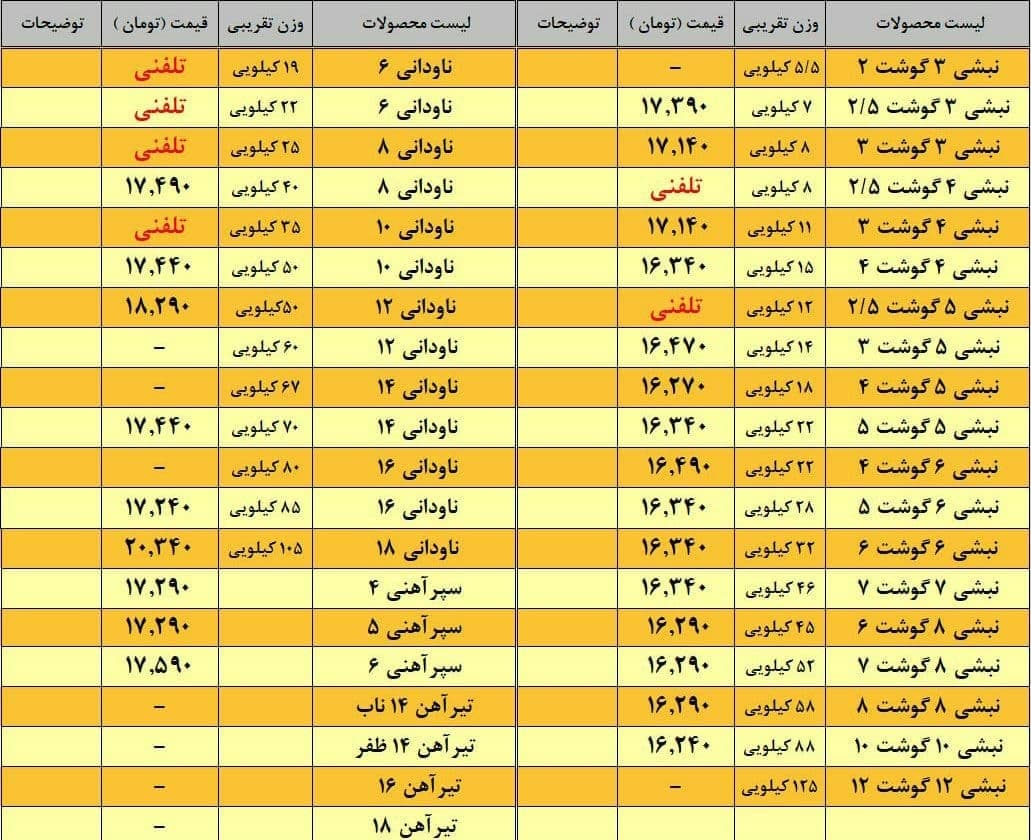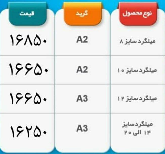 فولاد آریا ذوب سایز ۸------۱۶۱۵۰۰ آنالیز A2 سایز ۱۰ ----- ۱۵۶۵۰۰ آنالیز A2 سایز ۱۲ -------۱۵۶۵۰۰ سایز ۱۴-------- ۱۵۳۵۰۰ سایز ۱۶-------- ۱۵۳۵۰۰ سایز ۱۸-- ...