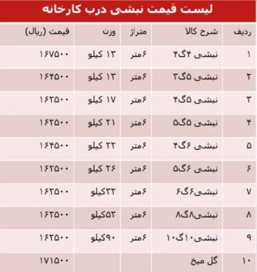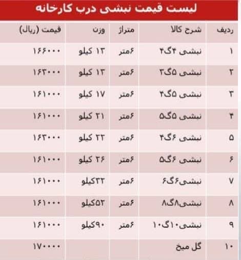 ٨شاخه درب كارخانه. ۱۶۸۰۰۰ ١٠شاخه درب كارخانه ۱۶۳۰۰۰ ١٢ شاخه درب كارخانه. ۱۶۱۰۰۰ ۱۴ شاخه درب كارخانه. ۱۵۸۰۰۰ ١٦ شاخه درب كارخانه. ...