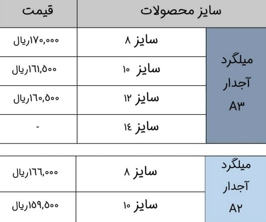 فولاد راد همدان سایز8 👈 171250 سایز 10 👈 168750 سایز12 👈 165250 سایز14 👈 164250 سایز16 👈 164250 سایز18 👈 164250 سایز20 ...