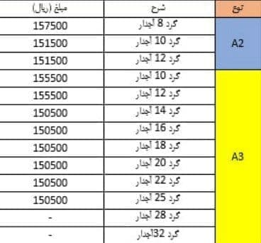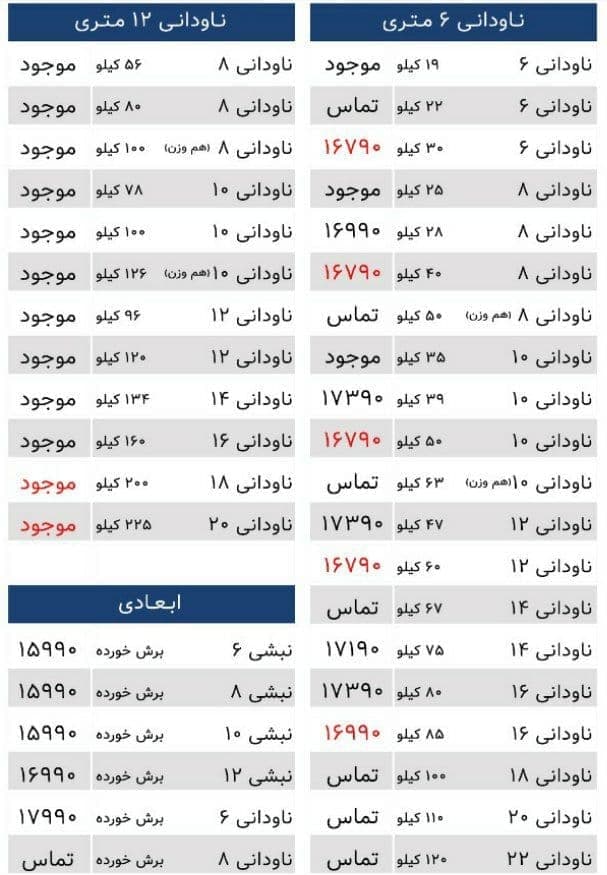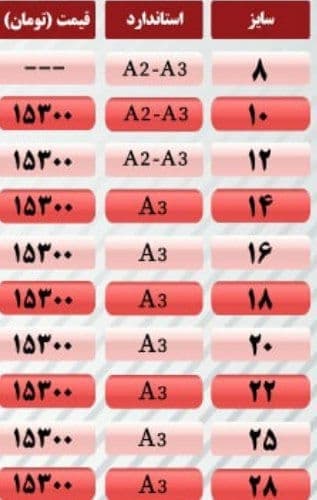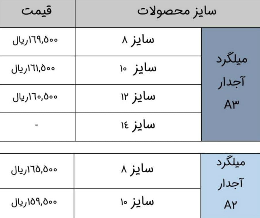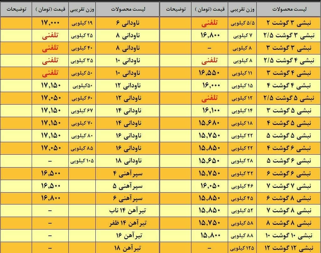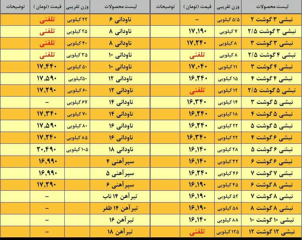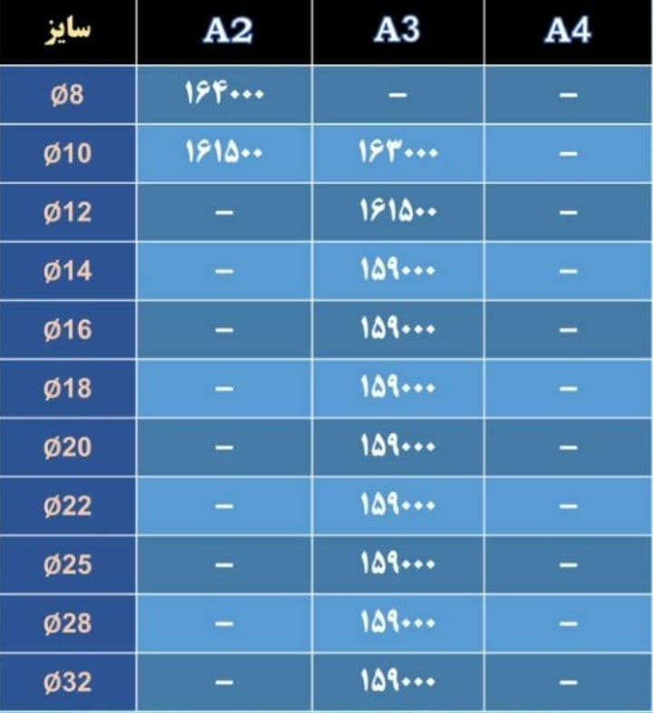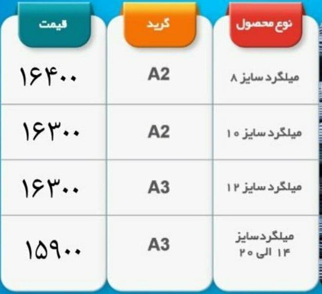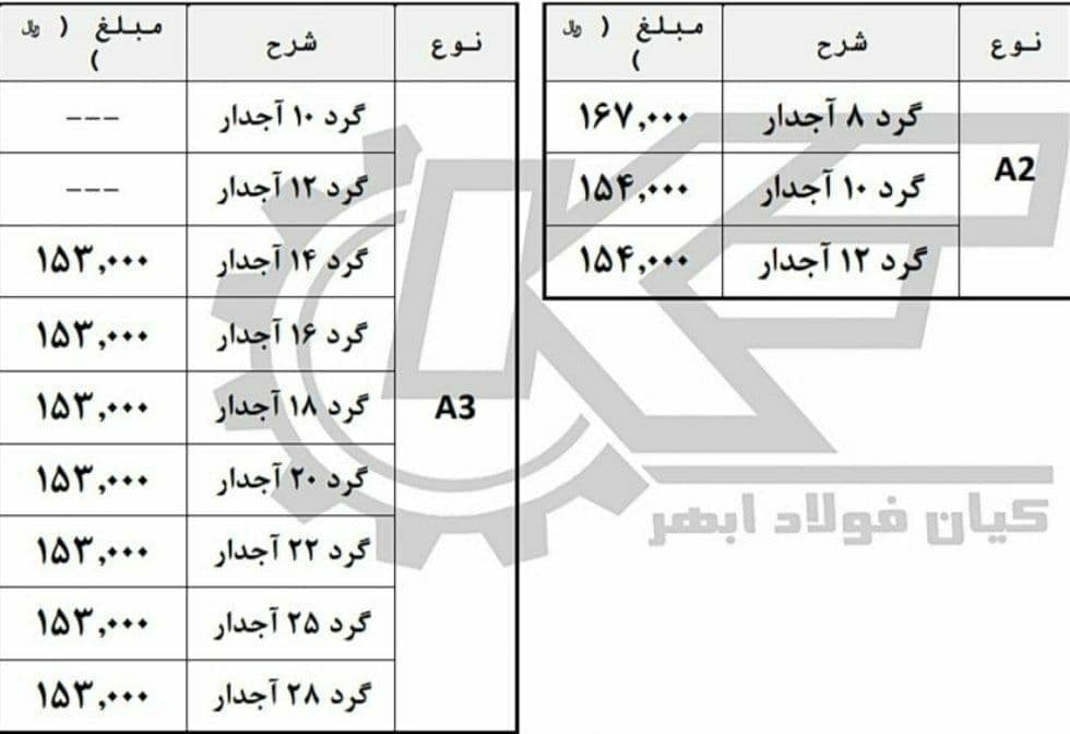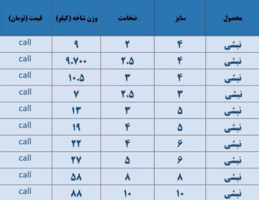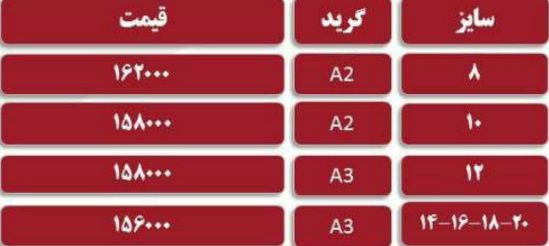 فولاد راد همدان سایز8 👈 167350 سایز 10 👈 163850 سایز12 👈 161350 سایز14 👈 160350 سایز16 👈 160350 سایز18 👈 160350 سایز2 ...