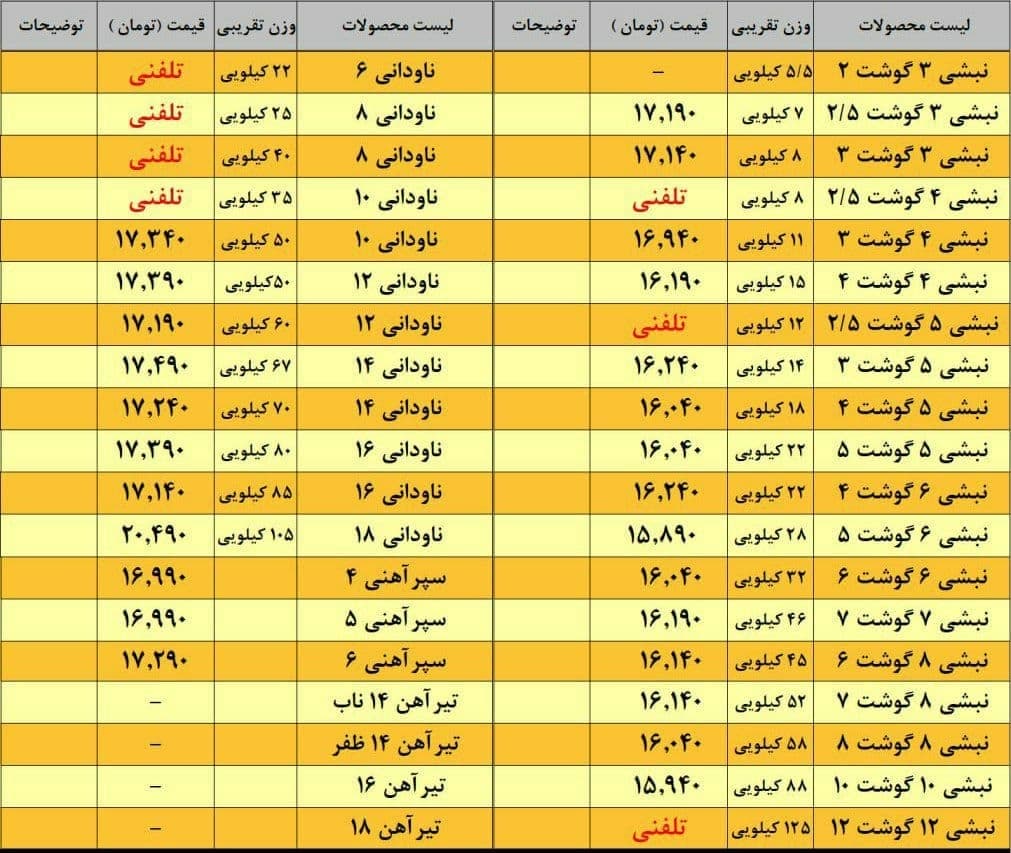 فولاد ماهان تیرآهن ۱۴ درجه یک قیمت 1/900/000 تومان تیر ۱۴ درجه ۱/۵ قیمت تومان 1/880/000 تیرآهن ۱۶ درجه یک قیمت 2/600/000 تومان تیرآهن ۱۶ درجه ۱/۵ ق ...