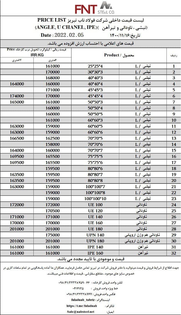 فولاد جاوید بناب 🔹نبشی 40*3 سبک : ۱۶۹۵۰۰ ریال 🔹نبشی 40*3 : ۱۶۵۴۰۰ ریال 🔹نبشی 40*4 سبک : ۱۶۵۲۰۰ ریال 🔹نبشی 40*4 : ۱۵۷۴۰۰ ریال 🔹نبشی 50*3 سبک : ۱۶۹۵۰ ...