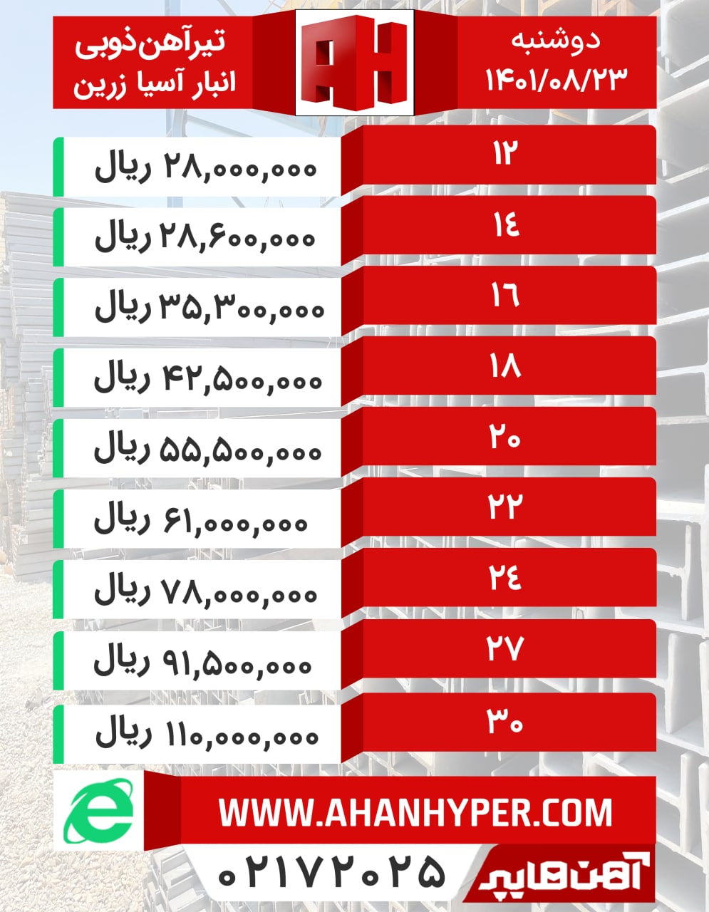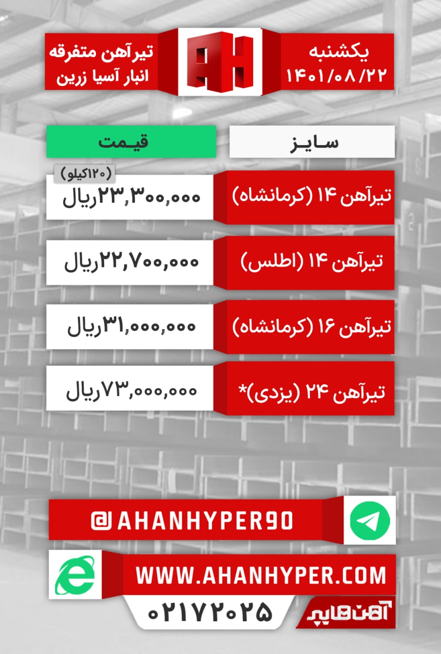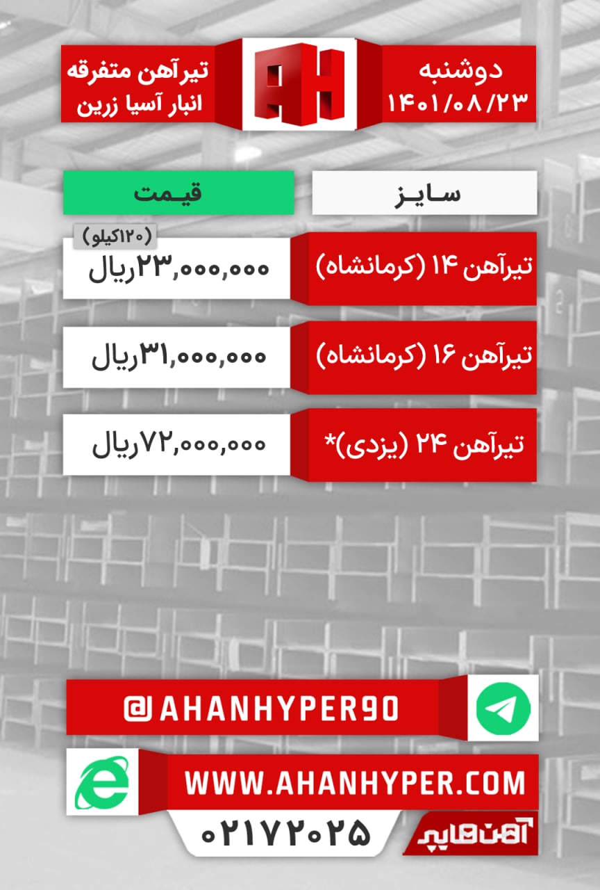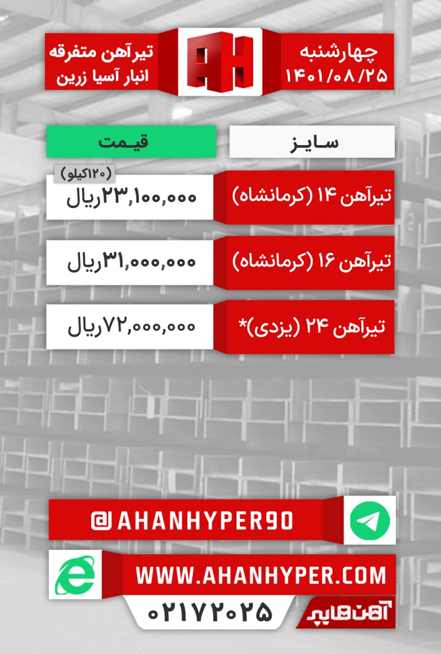 تیرآهن #متفرقه انبار #اصفهان (شاخهای) تیر۱۴ اطلس: ۲۳.۵۰۰.۰۰۰ ریال تیر۱۴ اهوازی: ۲۵.۵۰۰.۰۰۰ ریال تیر۱۶ کرمانشاه: ۳۱.۰۰۰.۰۰۰ ریال تیر۲۴ یزدی: ۷۰.۰۰۰.۰۰۰ ریال با ...
