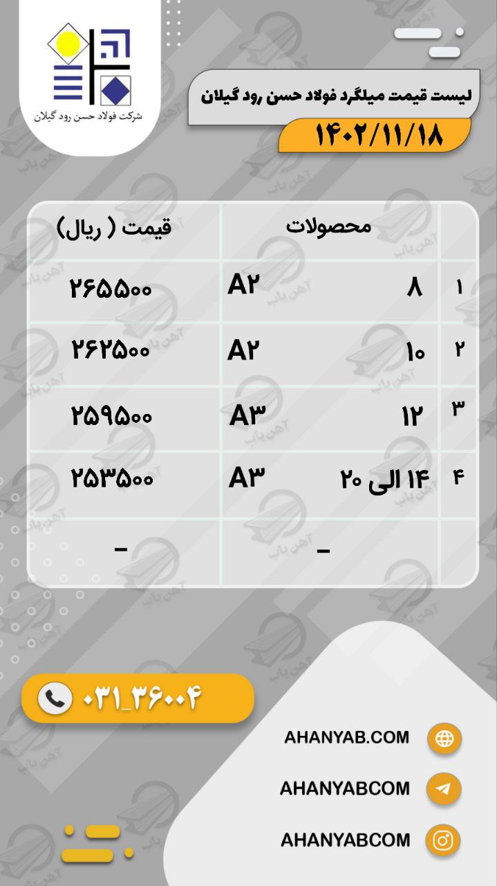 اعلام موجودی میلگرد آهن یاب لیست کالای فولاد آناهیتا گیلان : 📅 دوشنبه : ۱۴۰۲/۱۱/۱۶ (کاهش قیمت) ♦️ میلگرد ۱۰ A2 💵26150 تومان 📉 300 ♦️ میلگرد ۱۲ A3 💵26150 ت ...