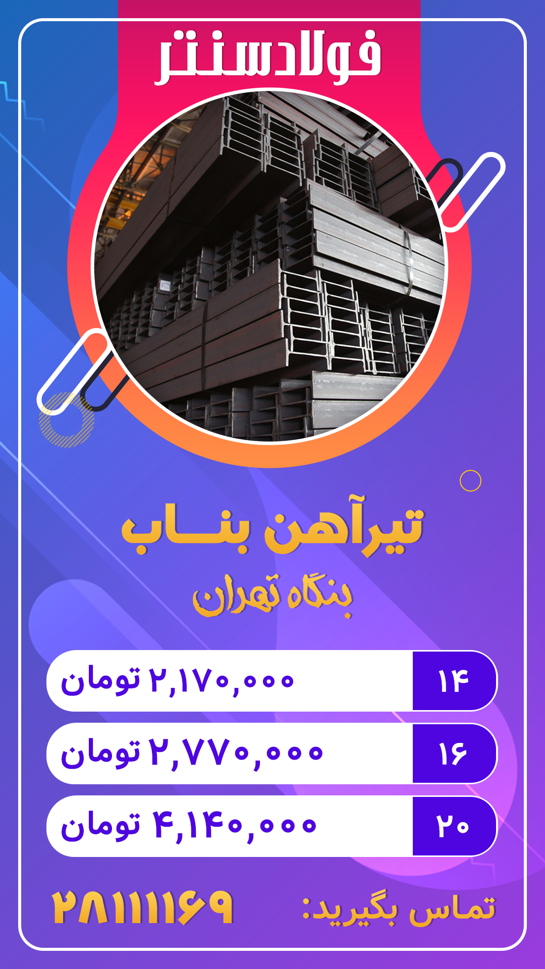 تیرآهن بناب(فاکتور رسمی) انبار تهران تیرآهن 14 بناب 125کیلو 21,700,000﷼ تیرآهن 16 بناب 170کیلو 27,700,000﷼ تیرآهن 20 بناب ...