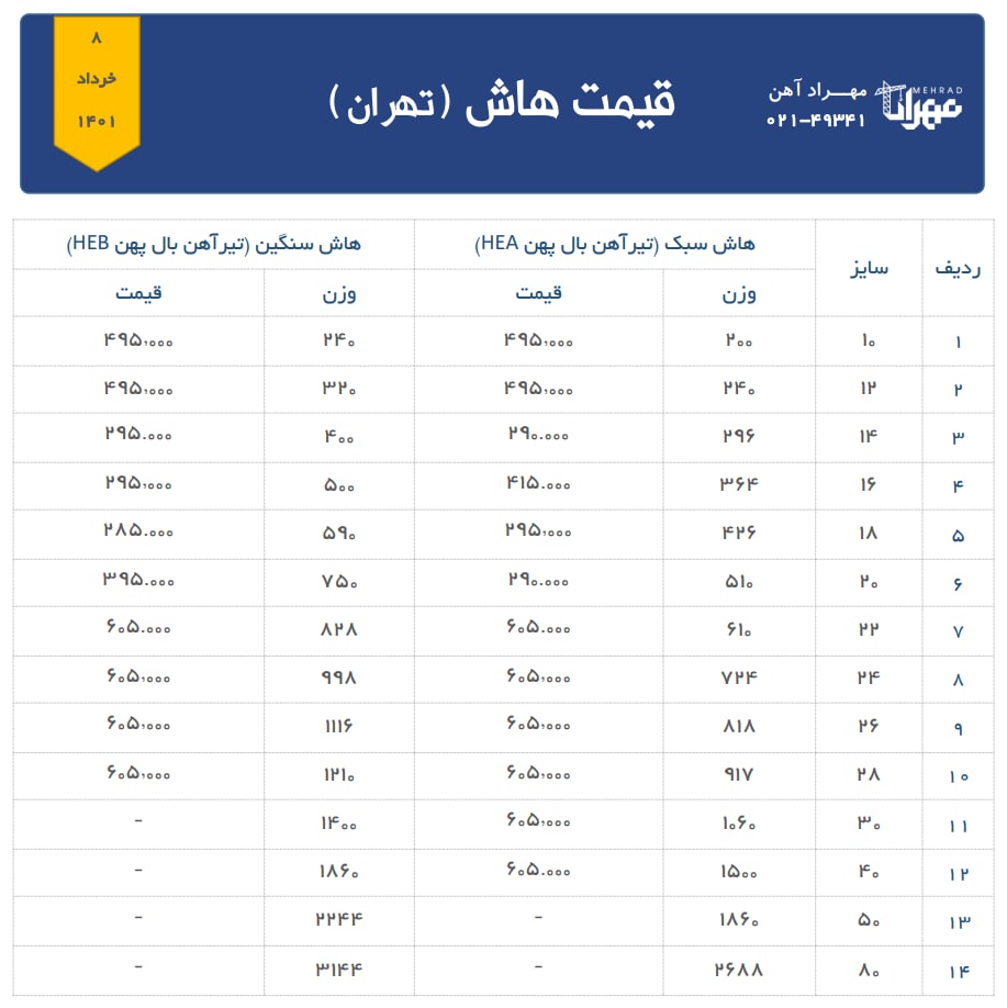 شرکت سام گستر دقیق (مهراد آهن) 📆 یکشنبه ۱۴۰۱/۰۳/۰۸ ⬅️ قیمت تیرآهن هاش (تهران) 📞 ۰۲۱-۴۹۳۴۱ https://t.me/mehradahan https://instagram.com/mehradahan 🌐 www.me ...