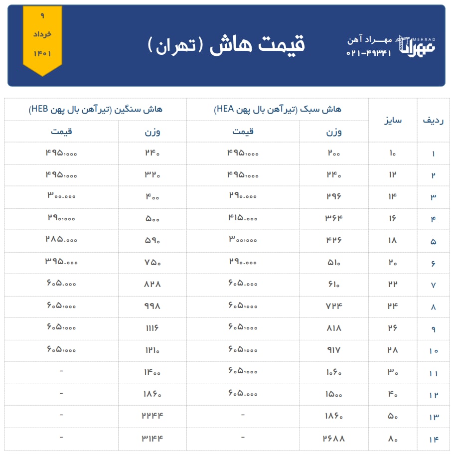 شرکت سام گستر دقیق (مهراد آهن) 📆 دوشنبه ۱۴۰۱/۰۳/۰۹ ⬅️ قیمت تیرآهن هاش (تهران) 📞 ۰۲۱-۴۹۳۴۱ https://t.me/mehradahan https://instagram.com/mehradahan 🌐 www.me ...