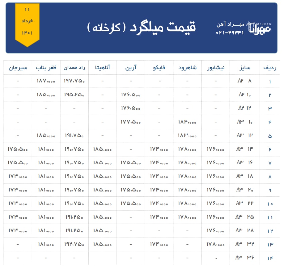 شرکت سام گستر دقیق (مهراد آهن) 📆 چهارشنبه ۱۴۰۱/۰۳/۱۱ ⬅️ قیمت میلگرد (کارخانه) 📞 ۰۲۱-۴۹۳۴۱ https://t.me/mehradahan https://instagram.com/mehrad ...