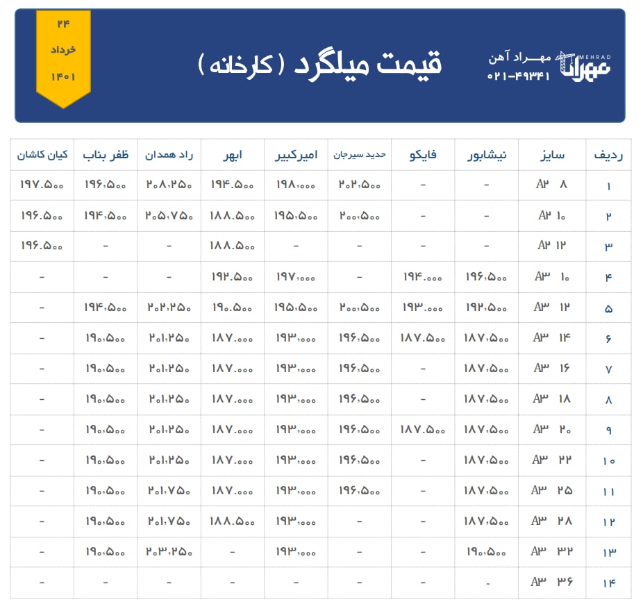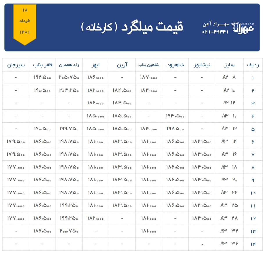 شرکت سام گستر دقیق (مهراد آهن) 📆 سه شنبه ۱۴۰۱/۰۳/۲۴ ⬅️ قیمت میلگرد (کارخانه) 📞 ۰۲۱-۴۹۳۴۱ https://t.me/mehradahan https://instagram.com/mehrada ...
