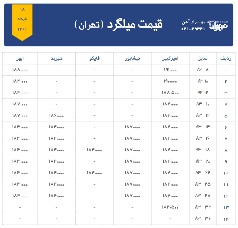 شرکت سام گستر دقیق (مهراد آهن) 📆 سه شنبه ۱۴۰۱/۰۳/۲۴ ⬅️ قیمت میلگرد (تهران) 📞 ۰۲۱-۴۹۳۴۱ https://t.me/mehradahan https://instagram.com/mehradaha ...