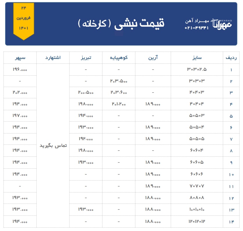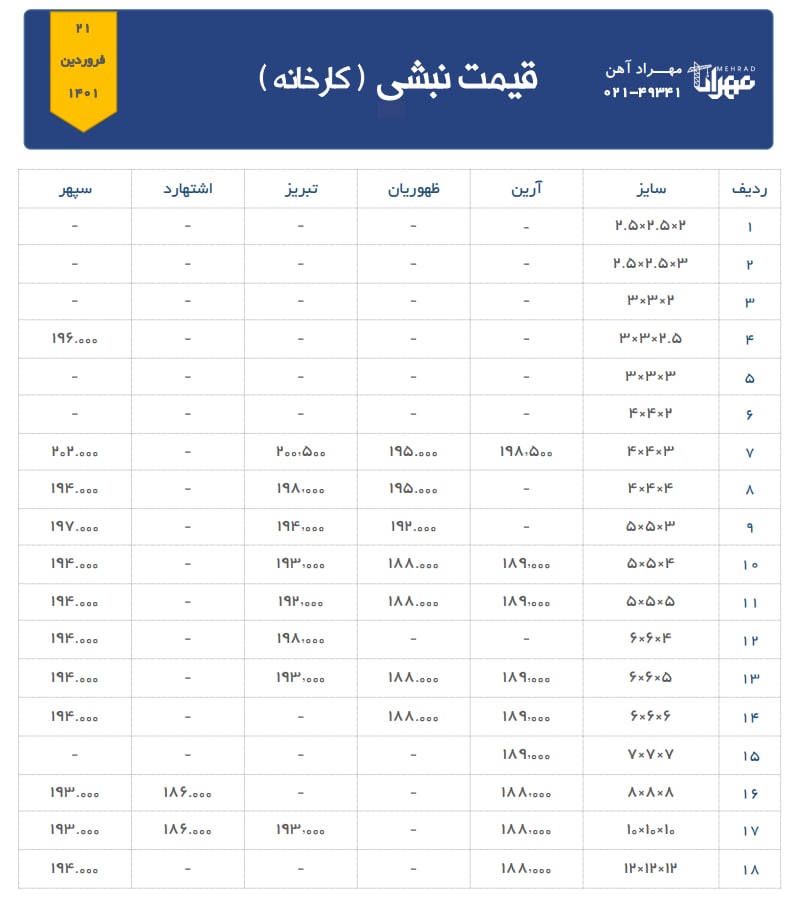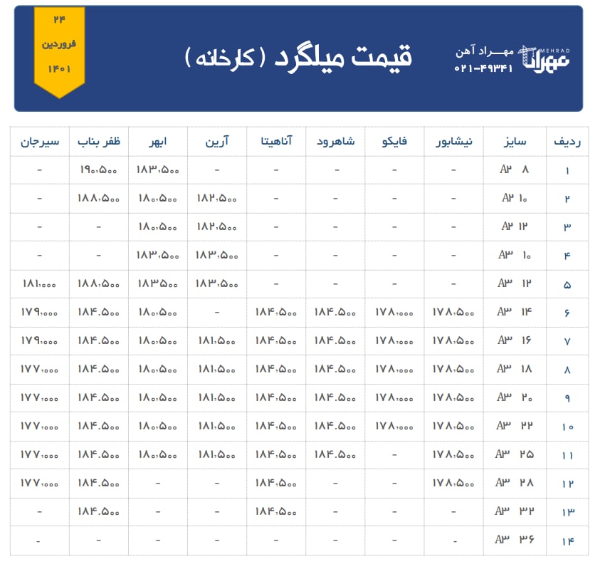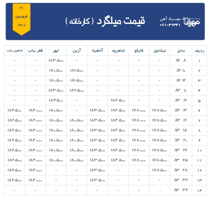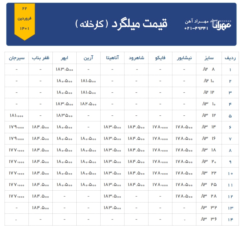 شرکت سام گستر دقیق (مهراد آهن) 📆 یکشنبه ۱۴۰۱/۰۱/۲۱ ⬅️ قیمت میلگرد (کارخانه) 📞 ۰۲۱-۴۹۳۴۱ https://t.me/mehradahan 🌐 www.mehradahan.com