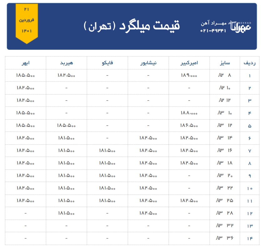 شرکت سام گستر دقیق (مهراد آهن) 📆 یکشنبه ۱۴۰۱/۰۱/۲۱ ⬅️ قیمت میلگرد (تهران) 📞 ۰۲۱-۴۹۳۴۱ https://t.me/mehradahan 🌐 www.mehradahan.com