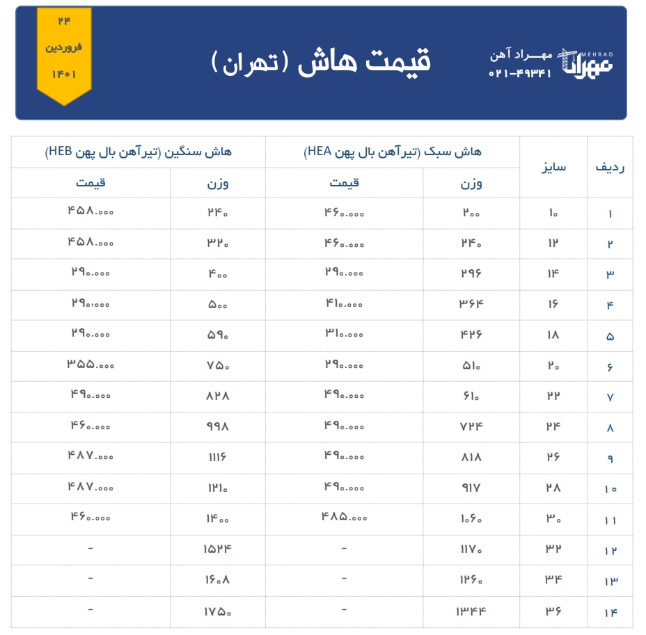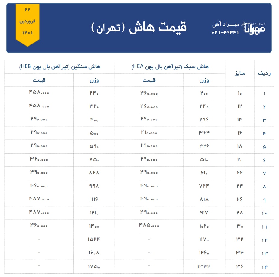 شرکت سام گستر دقیق (مهراد آهن) 📆 دوشنبه ۱۴۰۱/۰۱/۲۲ ⬅️ قیمت تیرآهن هاش (تهران) 📞 ۰۲۱-۴۹۳۴۱ https://t.me/mehradahan 🌐 www.mehradahan.com