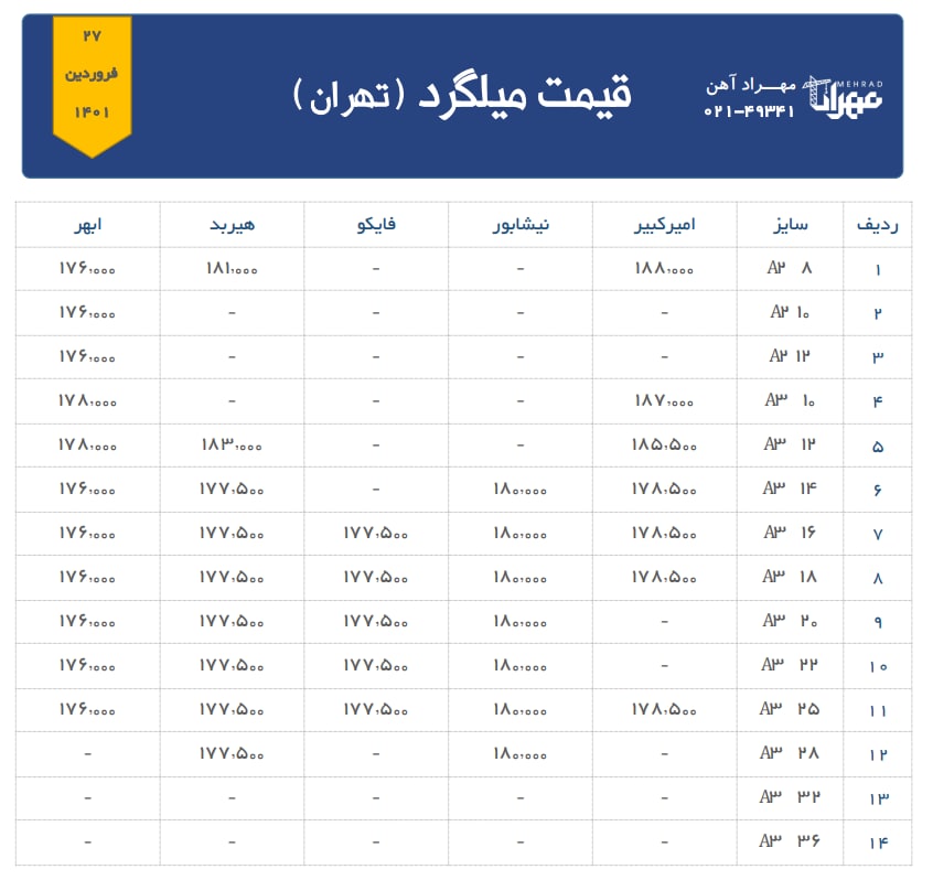 شرکت سام گستر دقیق (مهراد آهن) 📆 شنبه ۱۴۰۱/۰۱/۲۷ ⬅️ قیمت میلگرد (تهران) 📞 ۰۲۱-۴۹۳۴۱ https://t.me/mehradahan 🌐 www.mehradahan.com