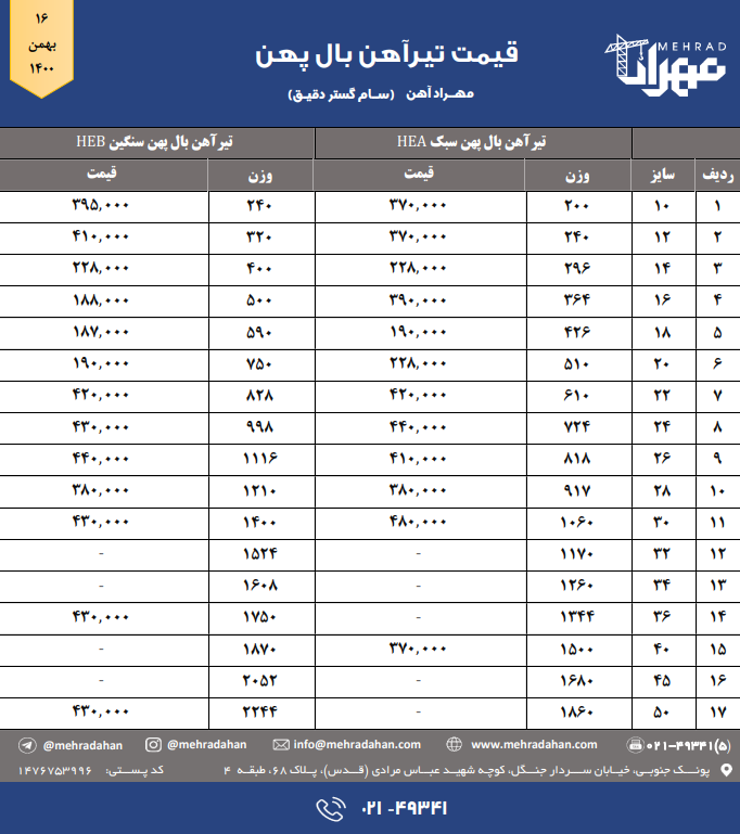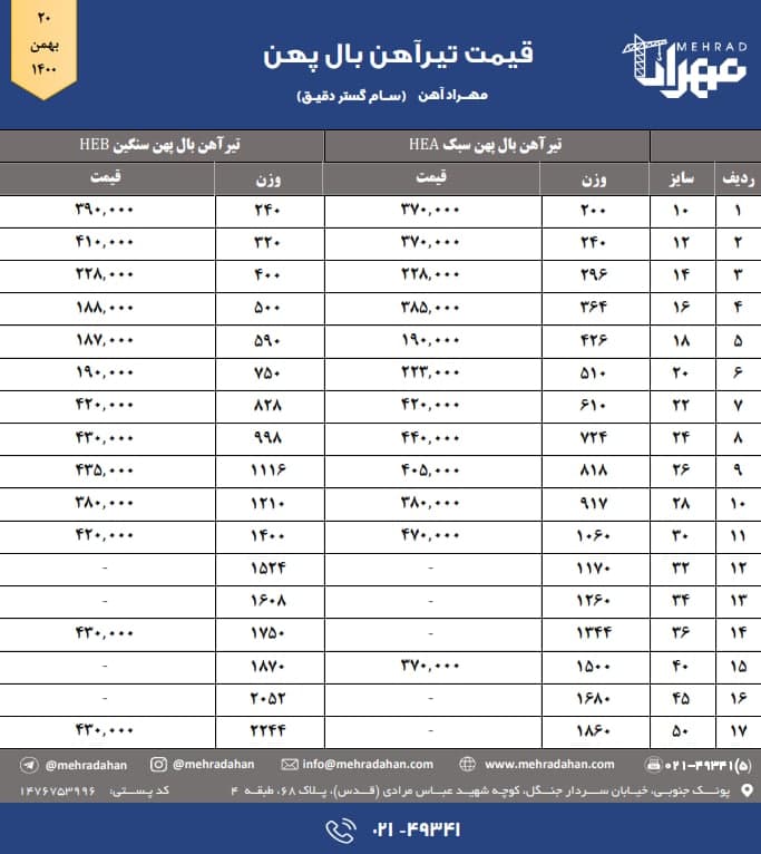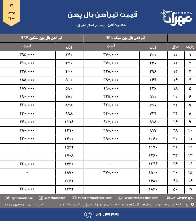 شرکت سام گستر دقیق (مهراد آهن) 📆 چهارشنبه ۱۴۰۰/۱۱/۲۰ ⬅️ قیمت تیرآهن بال پهن سبک و سنگین 📞 ۰۲۱-۴۹۳۴۱ https://t.me/mehradahan 🌐 www.mehradahan.com
