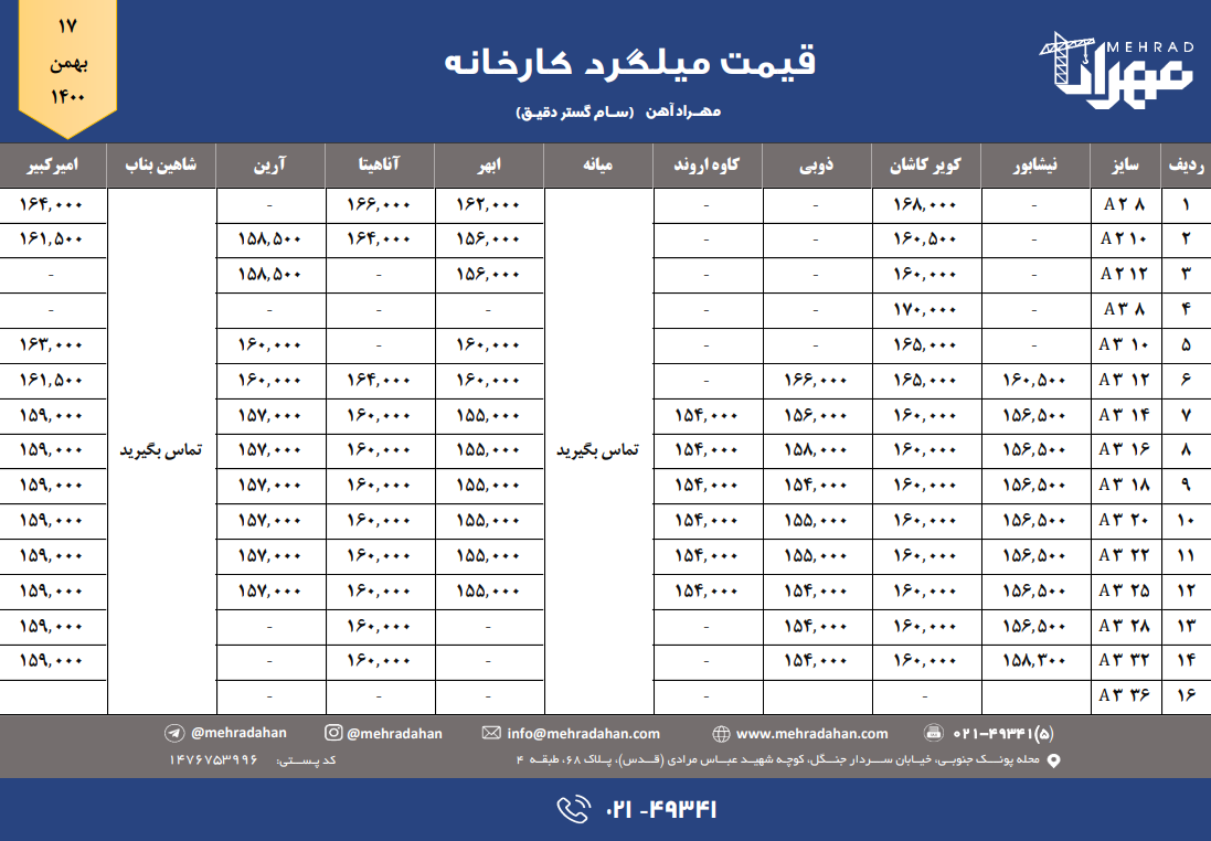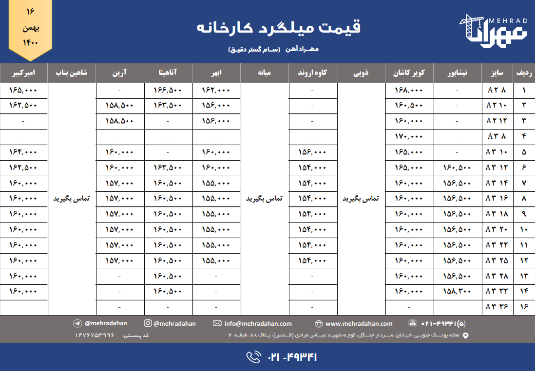 شرکت سام گستر دقیق (مهراد آهن) 📆 شنبه ۱۴۰۰/۱۱/۱۶ ⬅️ قیمت میلگرد (کارخانه) 📞 ۰۲۱-۴۹۳۴۱ https://t.me/mehradahan 🌐 www.mehradahan.com