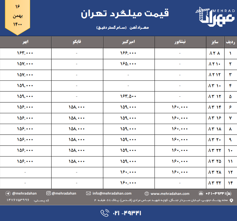شرکت سام گستر دقیق (مهراد آهن) 📆 شنبه ۱۴۰۰/۱۱/۱۶ ⬅️ قیمت میلگرد (تهران) 📞 ۰۲۱-۴۹۳۴۱ https://t.me/mehradahan 🌐 www.mehradahan.com