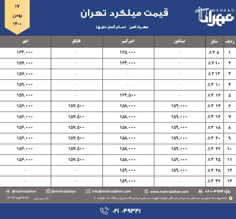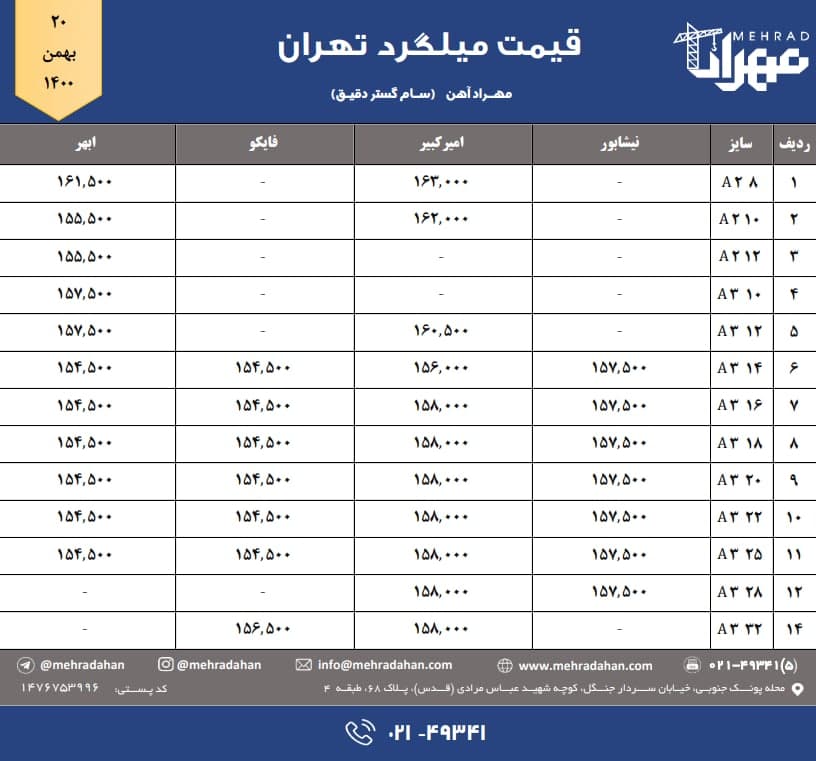 شرکت سام گستر دقیق (مهراد آهن) 📆 چهارشنبه ۱۴۰۰/۱۱/۲۰ ⬅️ قیمت میلگرد (تهران) 📞 ۰۲۱-۴۹۳۴۱ https://t.me/mehradahan 🌐 www.mehradahan.com