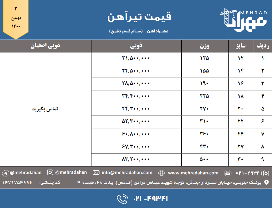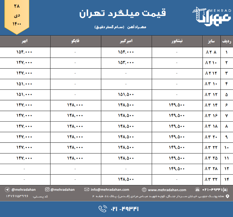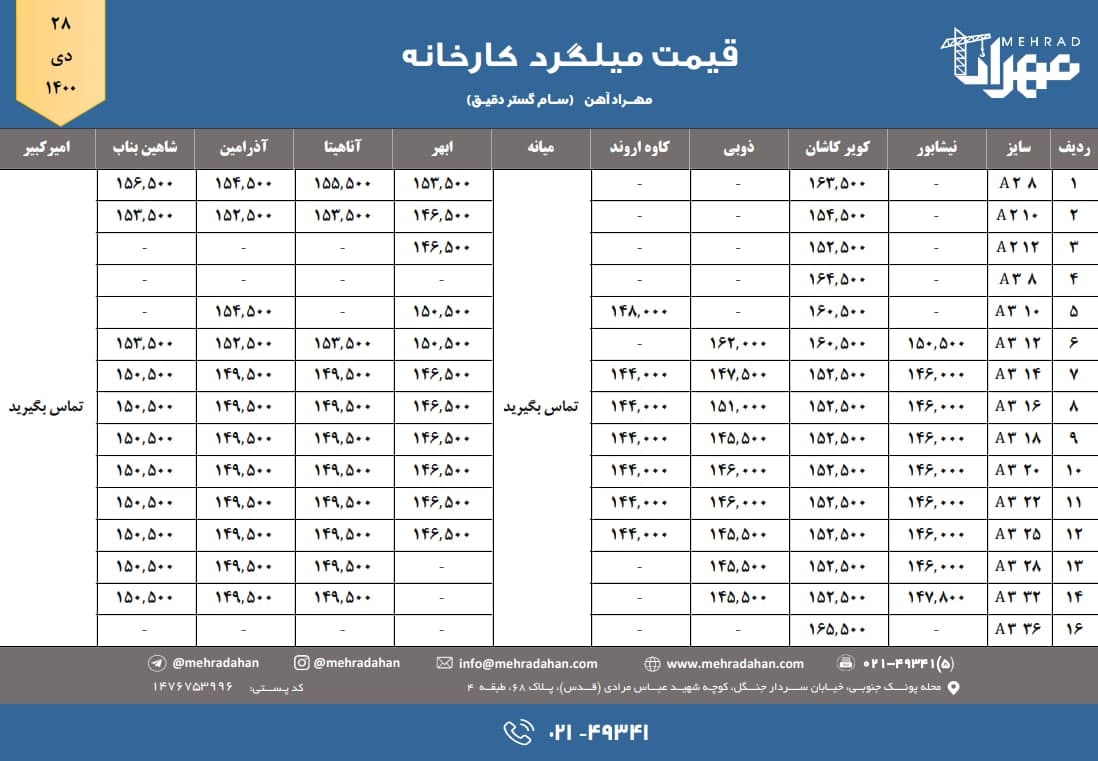 شرکت سام گستر دقیق (مهراد آهن) 📆 سه شنبه ۱۴۰۰/۱۰/۲۸ ⬅️ قیمت میلگرد (تهران) 📞 ۰۲۱-۴۹۳۴۱ @mehradahan 🌐 www.mehradahan.com