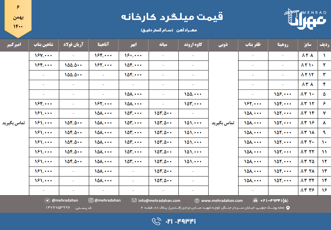 شرکت سام گستر دقیق (مهراد آهن) 📆 سه شنبه ۱۴۰۰/۱۱/۰۵ ⬅️ قیمت میلگرد (کارخانه) 📞 ۰۲۱-۴۹۳۴۱ @mehradahan 🌐 www.mehradahan.com