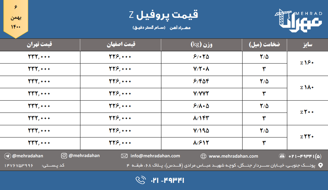 شرکت سام گستر دقیق (مهراد آهن) 📆 چهارشنبه ۱۴۰۰/۱۱/۰۶ ⬅️ قیمت پروفیل z 📞 ۰۲۱-۴۹۳۴۱ https://t.me/mehradahan 🌐 www.mehradahan.com