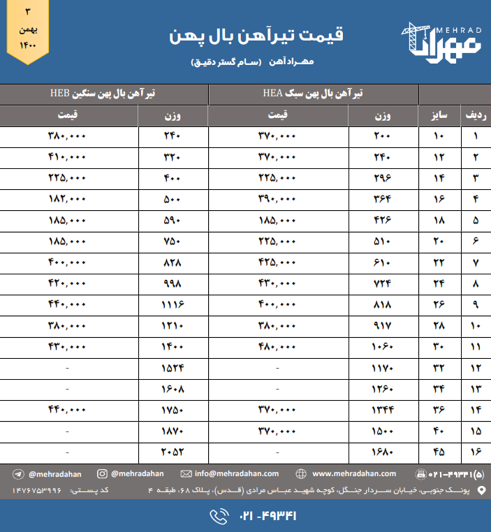 شرکت سام گستر دقیق (مهراد آهن) 📆 سه شنبه ۱۴۰۰/۱۱/۰۵ ⬅️ قیمت تیرآهن بال پهن سبک و سنگین 📞 ۰۲۱-۴۹۳۴۱ @mehradahan 🌐 www.mehradahan.com