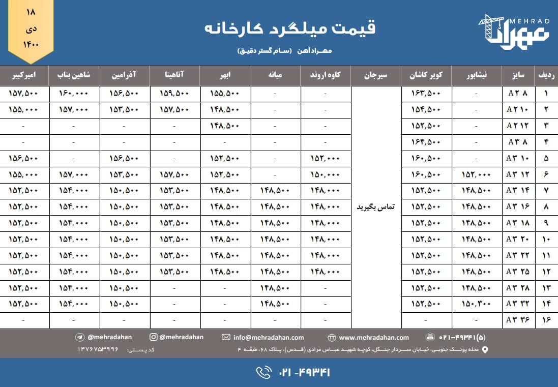 شرکت سام گستر دقیق (مهراد آهن) 📆 شنبه ۱۴۰۰/۱۰/۱۸ ⬅️ قیمت میلگرد (کارخانه) 📞 ۰۲۱-۴۹۳۴۱ @mehradahan 🌐 www.mehradahan.com