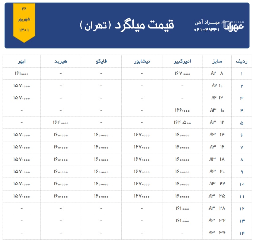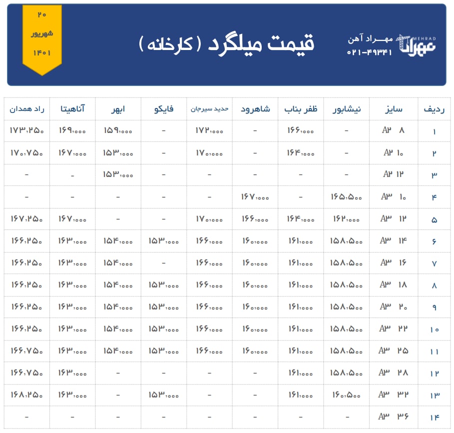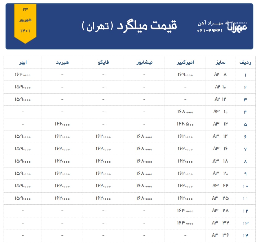 میلگرد A۳ ذوبی (کارخانه) ◽️میلگرد ۱۲ : ◽️میلگرد ۱۴ : ◽️میلگرد ۱۶ : ◽️میلگرد ۱۸: ◽️میلگرد ۲۰: ◽️میلگرد ۲۲: ◽️میلگرد ۲۵ : ...