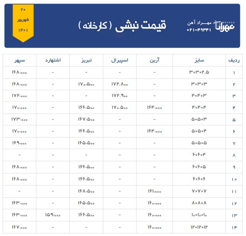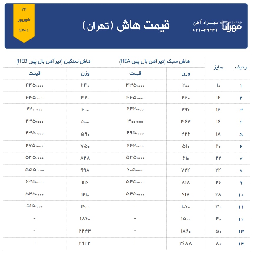 قیمت تیرآهن ذوبی (تهران) ◽️تیرآهن ۱۲ (۱۲۵ک) : ◽️تیرآهن ۱۴ (۱۵۵ک) : ◽️تیرآهن ۱۶ (۱۹۰ک) : ◽️تیرآهن ۱۸ (۲۲۵ک): ◽️تیرآهن ۲۰ (۲۷۰ک): ◽️تیرآ ...