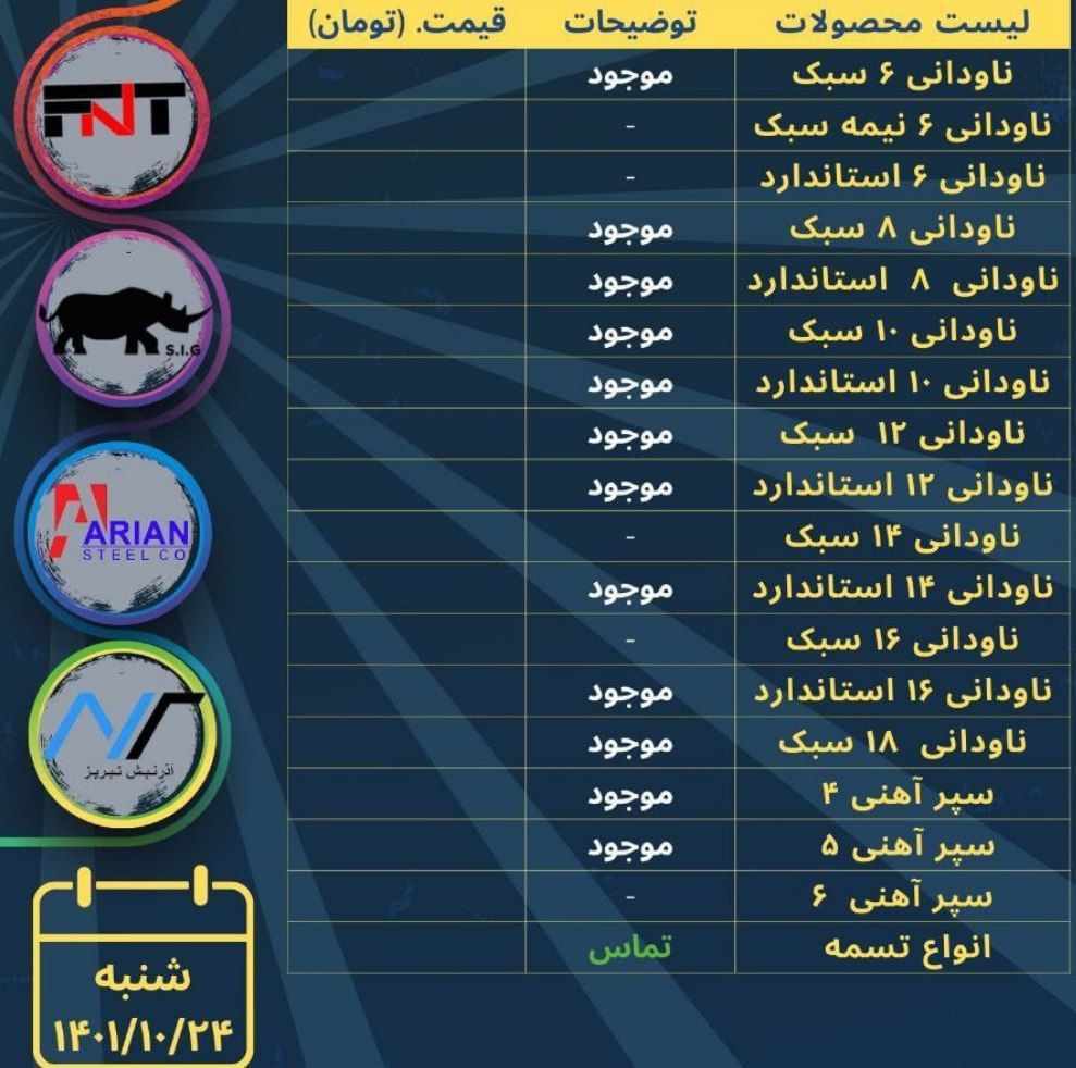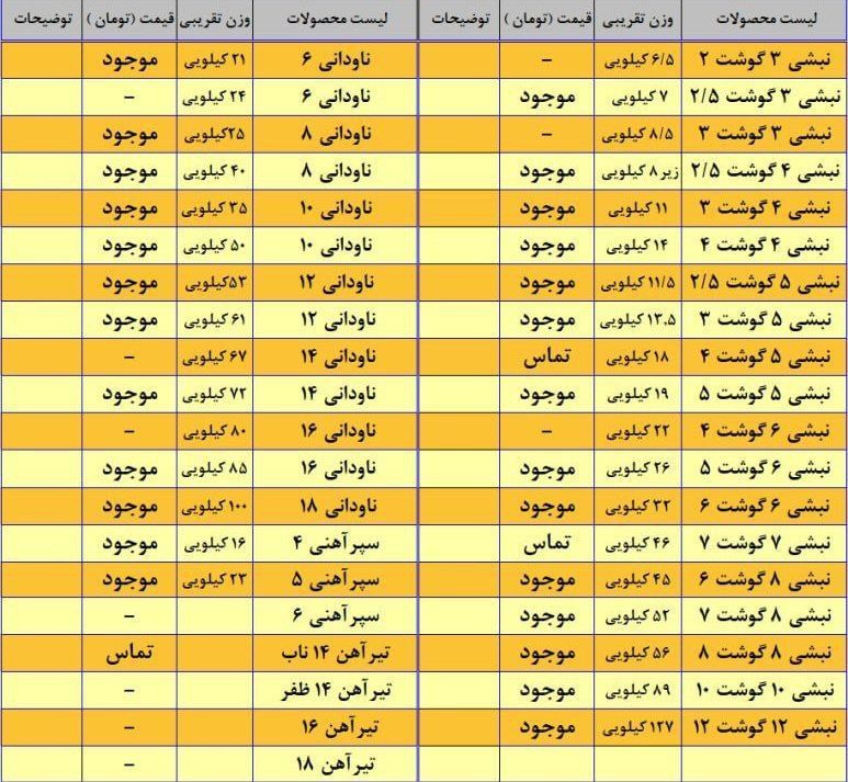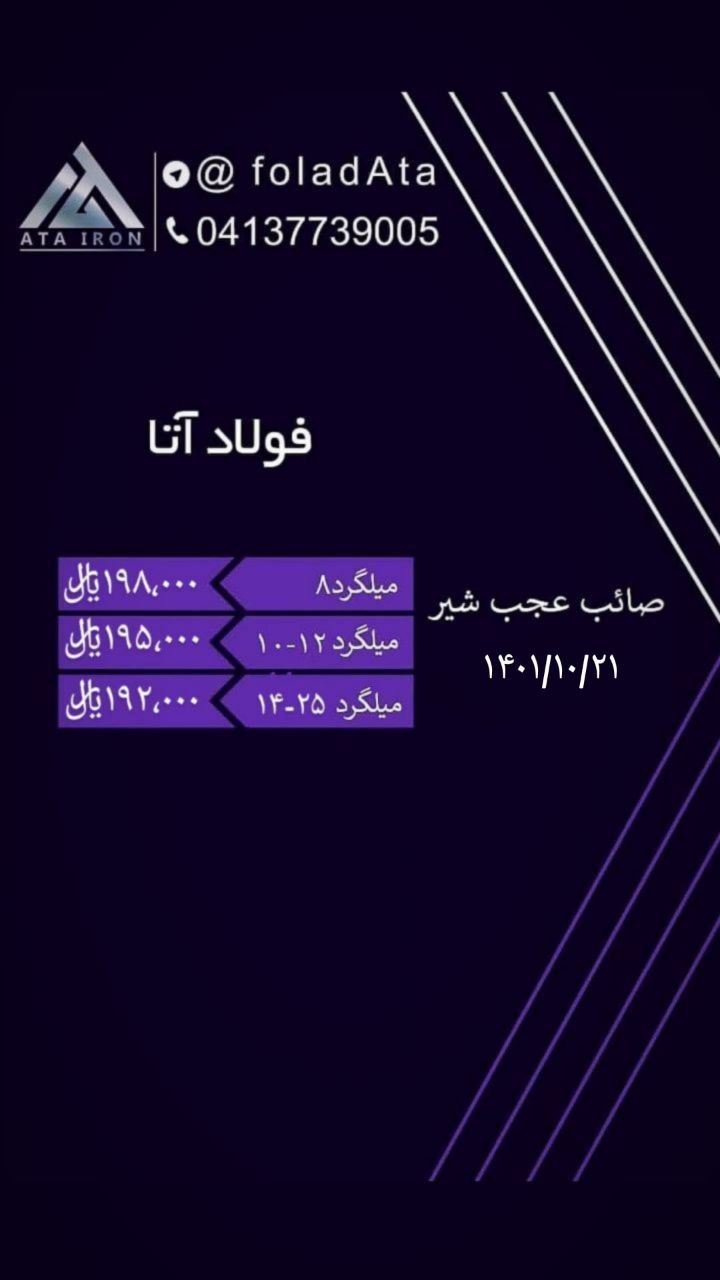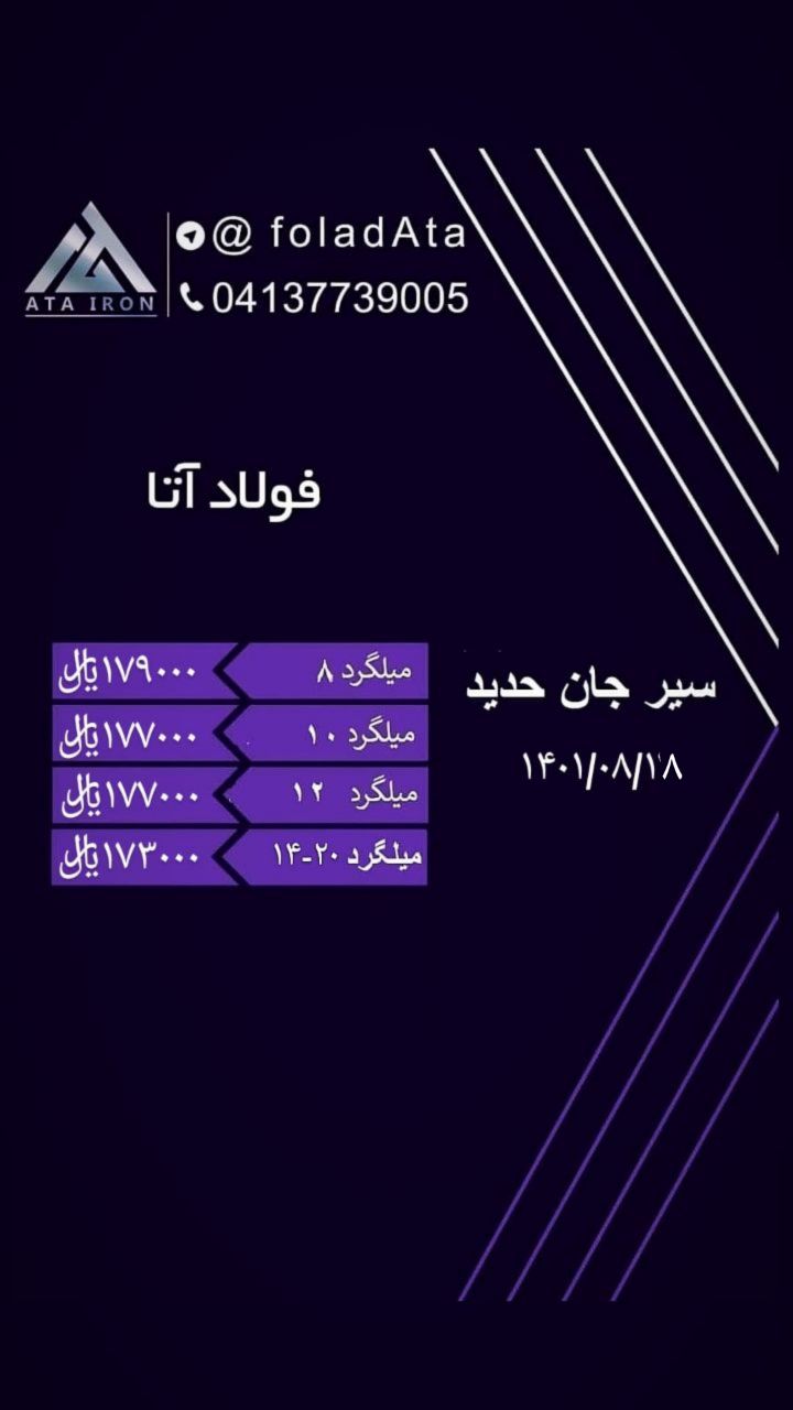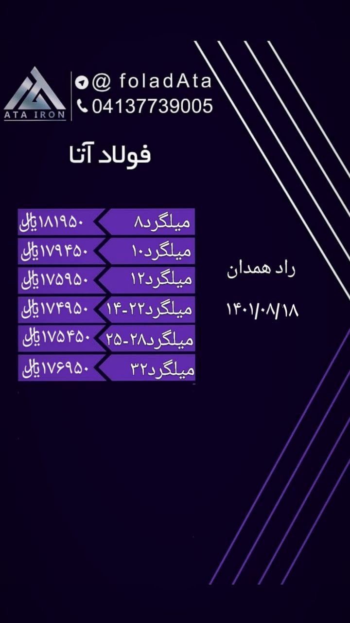 🔹️ذوب آهن آرمان آسیا 🔹️میلگرد ۸ ۱۶۲۰۰۰﷼ 🔹️میلگرد ۱۰ ۱۵۶۰۰۰﷼ 🔹️میلگرد ۱۲ ۱۵۶۰۰۰﷼ 🔹️میلگرد ۱۶ ۱۵۴۰۰۰﷼ ...