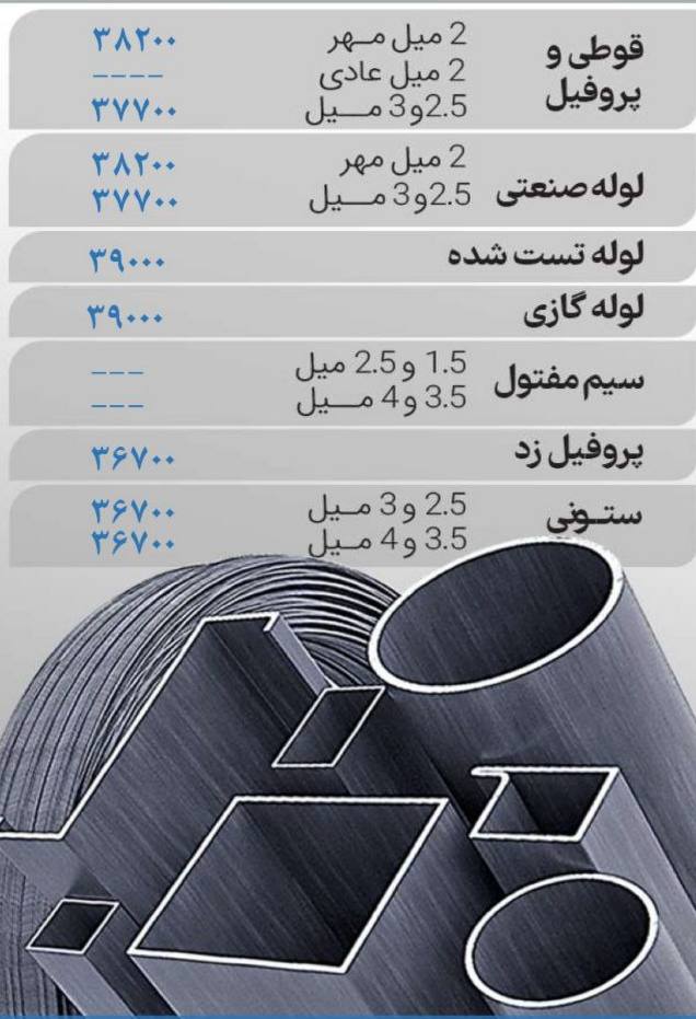 🔸 میلگرد ۸ آجدار: ۲۶۰۰۰۰﷼ 🔸 میلگرد ۱۰ آجدار:۲۵۶۰۰۰﷼ 🔸️ میلگرد ۱۲ آجدار: ۲۵۳۰۰۰﷼ 🔸️ میلگرد ۱۴تا ۱۶ آجدار: ۲۴۷۰۰۰﷼
