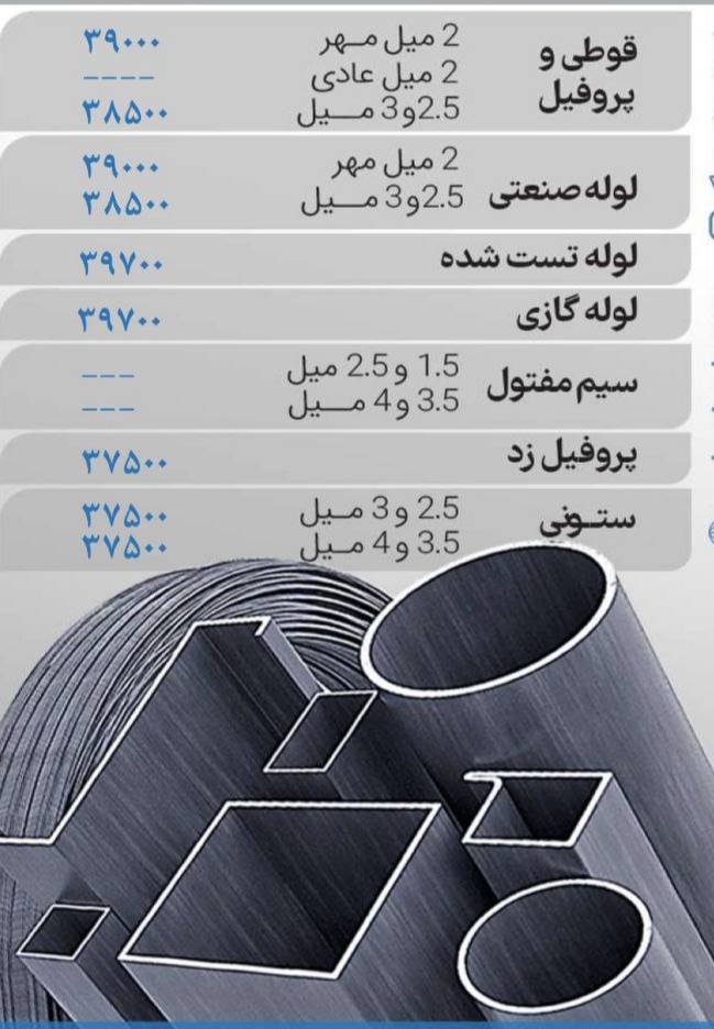 🔸 میلگرد ۸ آجدار: ۲۶۰۰۰۰﷼ 🔸 میلگرد ۱۰ آجدار:۲۵۶۰۰۰﷼ 🔸️ میلگرد ۱۲ آجدار: ۲۵۳۰۰۰﷼ 🔸️ میلگرد ۱۴تا ۱۶ آجدار: ۲۴۷۰۰۰﷼