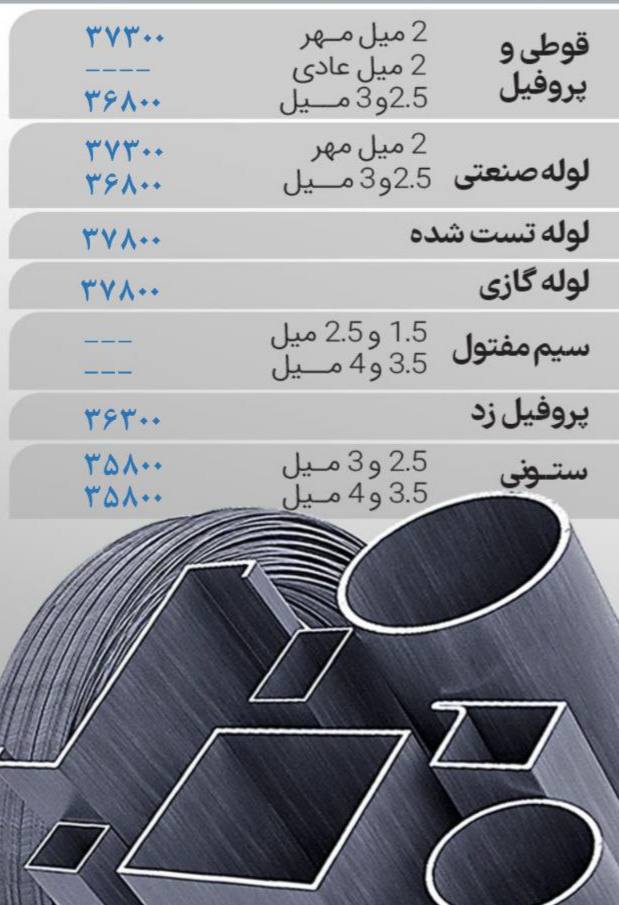 🔸تیرآهن سایز۱۲: ۳۸.۰۰۰.۰۰۰ ریال 🔸تیرآهن سایز۱۴: ۴۲.۰۰۰.۰۰۰ ریال 🔸تیرآهن سایز۱۶: ۴۹.۰۰۰.۰۰۰ ریال 🔸تیرآهن سایز۱۸: ۵۹.۰۰۰.۰۰۰ ریال 🔸تیرآهن سایز۲۰: ۷۱.۰۰۰.۰۰۰ ریال ...