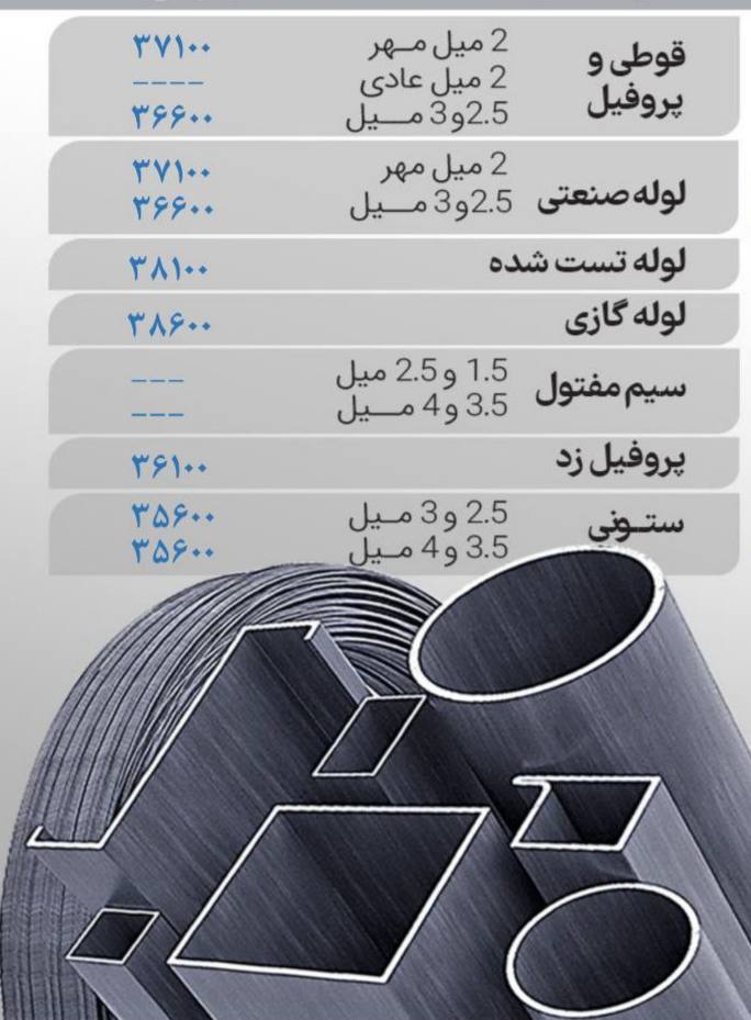🔸 میلگرد ۸ آجدار: ۲۵۴۰۰۰ ﷼ 🔸 میلگرد ۱۰ آجدار: ۲۵۰۰۰۰﷼ 🔸️ میلگرد ۱۲ آجدار: ۲۴۷۰۰۰﷼ 🔸️ میلگرد ۱۴تا ۱۶ آجدار: ۲۴۱۰۰۰﷼