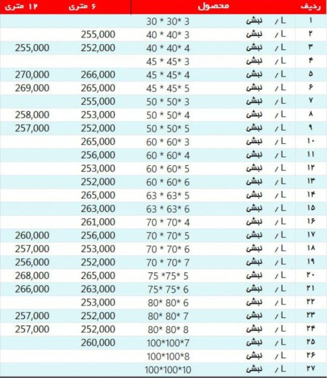🔸نبشی ۳*۴: ۲۵۷۰۰۰﷼ 🔸نبشی ۴*۴: 🔸نبشی ۳*۵: ۲۵۵۰۰۰﷼ 🔸نبشی۴*۵: ۲۵۱۰۰۰﷼ 🔸نبشی۵*۵ :۲۵۱۰۰۰﷼