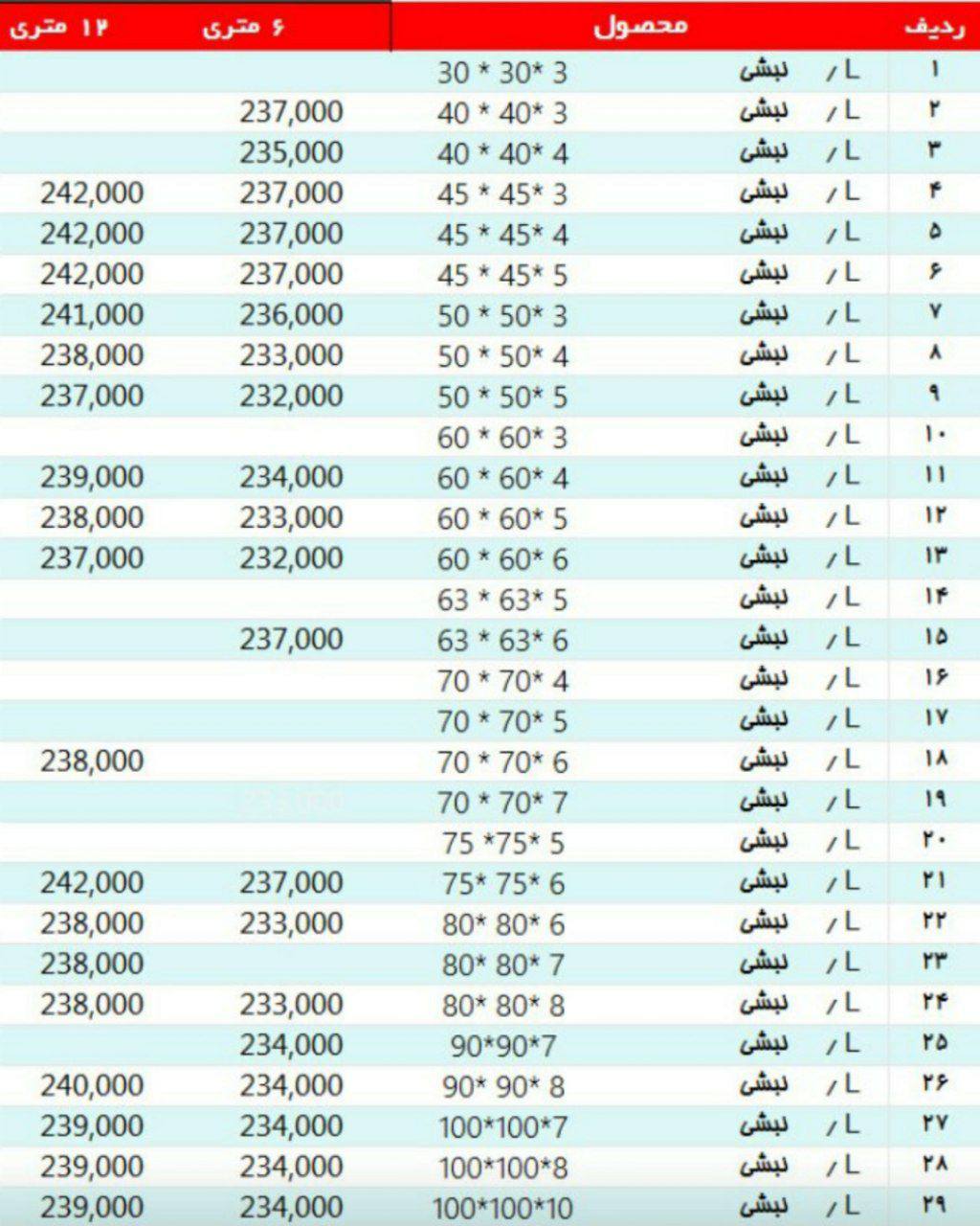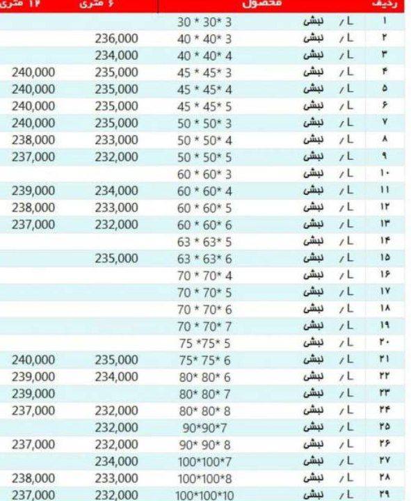 نبشی 3*۴ »»240500««« نبشی ۴*۴ »»»235000««« نبشی ۴*۵ »»»231000««« نبشی ۵*۵ »»»231000««« نبشی ۶*۶ »»» 231000««« نبشی ۷*۷ »»»231000««« نبشی ۸*۸»»»231000««« نبشی ۱۰ ...