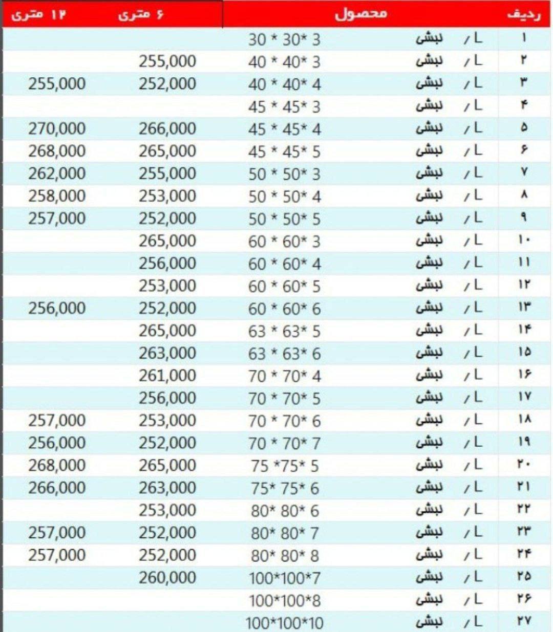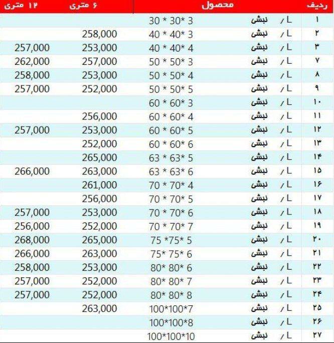 #آریان_فولاد نبشی 3*۴ »»261500««« نبشی ۴*۴ »»»250500««« نبشی ۴*۵ »»»250500««« نبشی ۵*۵ »»»250500««« نبشی ۶*۶ »»» 250500««« نبشی ۷*۷ »»»250500««« نبشی ۸*۸»»»250 ...