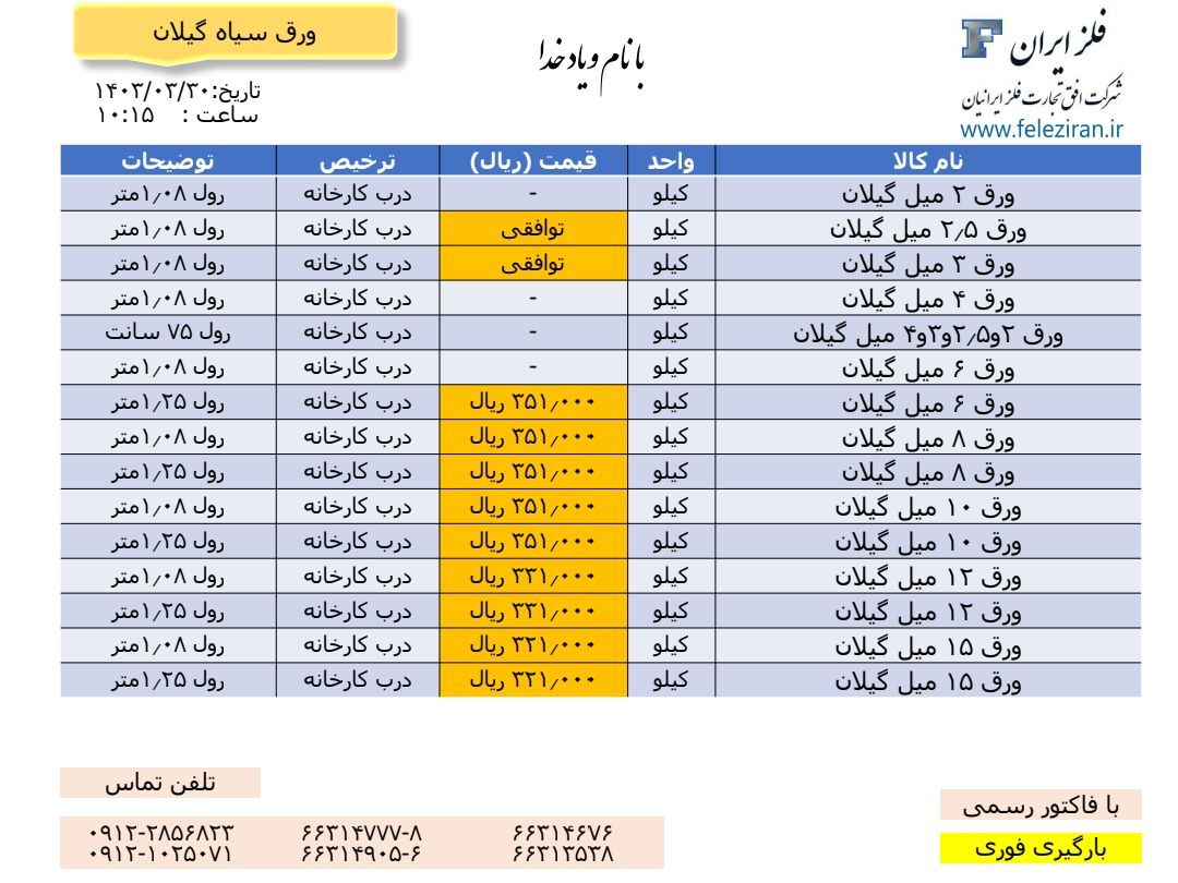 ◀️ورق ۱۵ میل فابریک کاویان ۶×۱.۵ 📍انبار تهران - بنگاه پویا 💵 ۳۷۵.۰۰۰ ریال غیر #فلزایران #قیمت_آهن_آلات #قیمت_ورق_کاویان