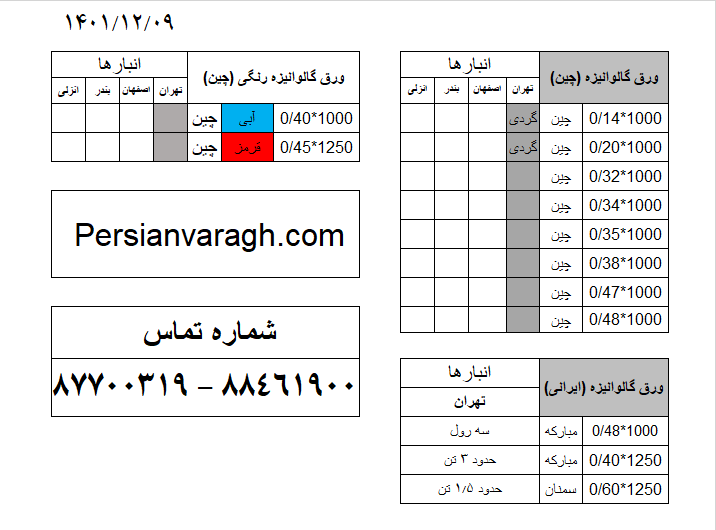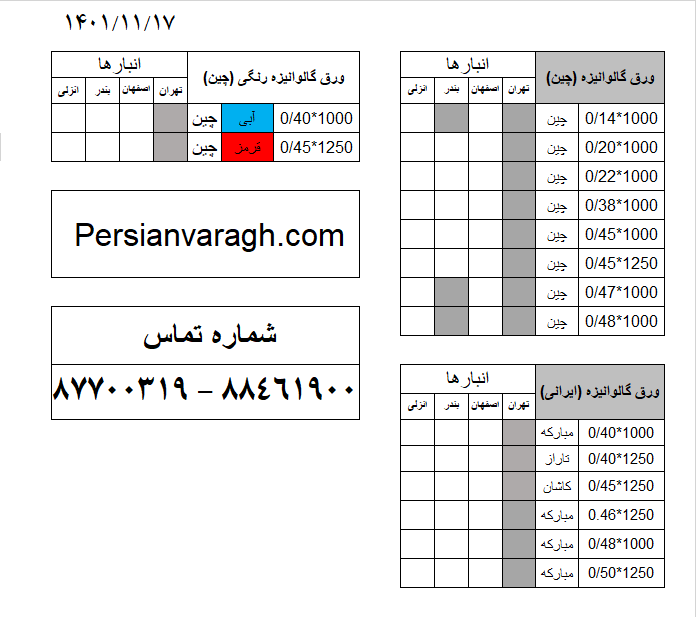 موجودی ورق گالوانیزه در تهران 0/14*1000 چین 0/20*1000 چین 0/22*1000 چین 0/45*1000 چین 0/47*1000 چین 0/48*1000 چین Persianvar ...