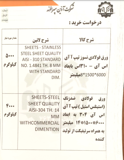 همکار گرامی در صورت موجود داشتن محصولات فوق لطفا برای اعلام قیمت خود با شماره 09394117828 تماس حاصل بفرمایید. باتشکر مدیر فروش شرکت آذین سپهر الوند