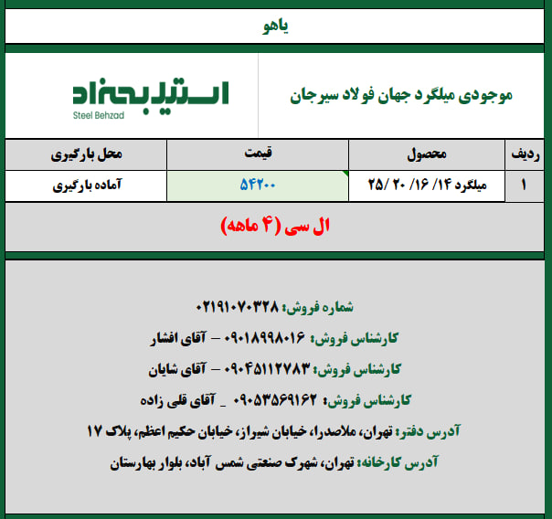 قیمتهای صنعت استیل بهزاد